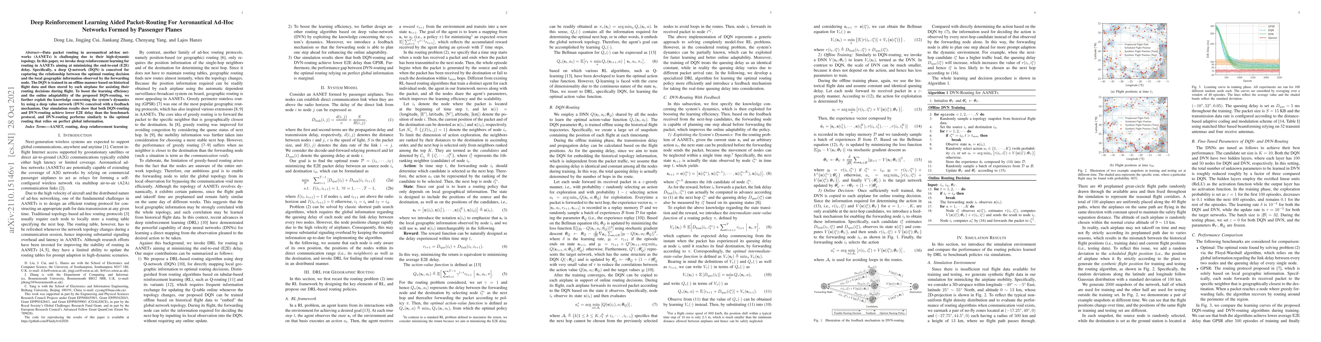 This paper proposes a deep reinforcement learning approach using a deep Q-network (DQN) to optimize packet routing in dynamic aeronautical ad-hoc networks (AANETs) by minimizing end-to-end delay. A deep value network (DVN) with a feedback mechanism further enhances learning efficiency and adaptability, achieving lower delays than benchmark protocols.