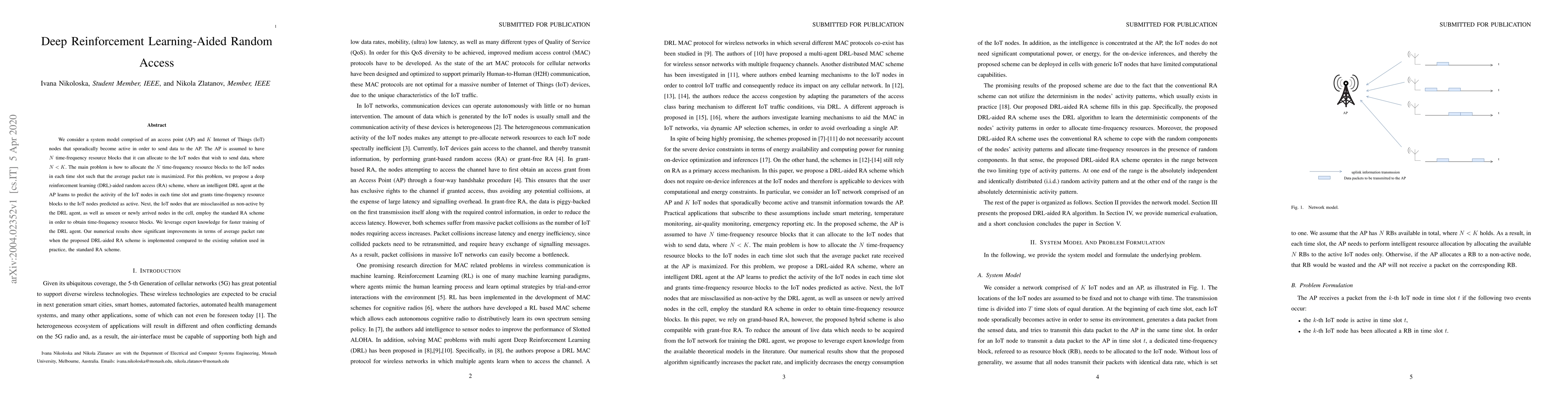 We consider a system model comprised of an access point (AP) and K Internet of Things (IoT) nodes that sporadically become active in order to send data to the AP. The AP is assumed to have N time-frequency resource blocks that it can allocate to the IoT nodes that wish to send data, where N < K. The main problem is how to allocate the N time-frequency resource blocks to the IoT nodes in each time slot such that the average packet rate is maximized. For this problem, we propose a deep reinforcement learning (DRL)-aided random access (RA) scheme, where an intelligent DRL agent at the AP learns to predict the activity of the IoT nodes in each time slot and grants time-frequency resource blocks to the IoT nodes predicted as active. Next, the IoT nodes that are missclassified as non-active by the DRL agent, as well as unseen or newly arrived nodes in the cell, employ the standard RA scheme in order to obtain time-frequency resource blocks. We leverage expert knowledge for faster training of the DRL agent. Our numerical results show significant improvements in terms of average packet rate when the proposed DRL-aided RA scheme is implemented compared to the existing solution used in practice, the standard RA scheme.