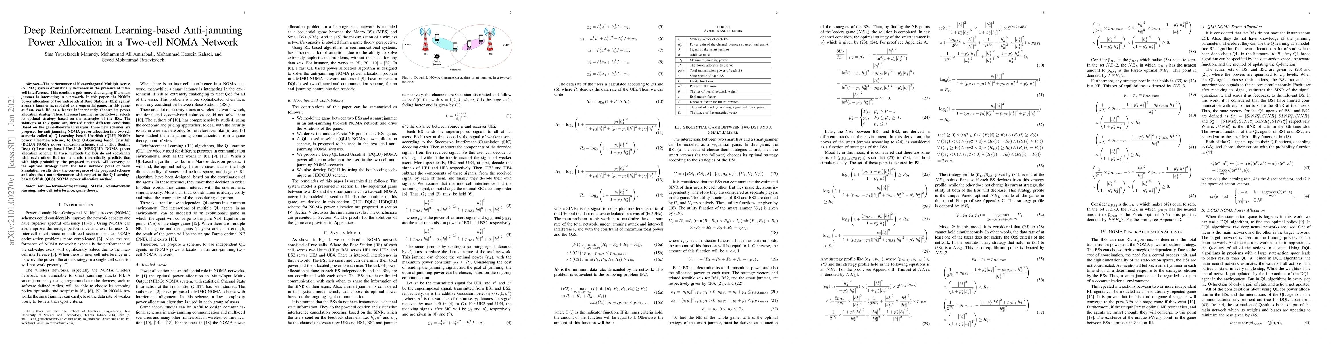 This paper proposes three deep reinforcement learning-based schemes for anti-jamming power allocation in a two-cell NOMA network against a smart jammer. The proposed QLU, DQLU, and HBDQLU schemes outperform the QLS method and are expected to converge to optimal strategies without inter-BS coordination.