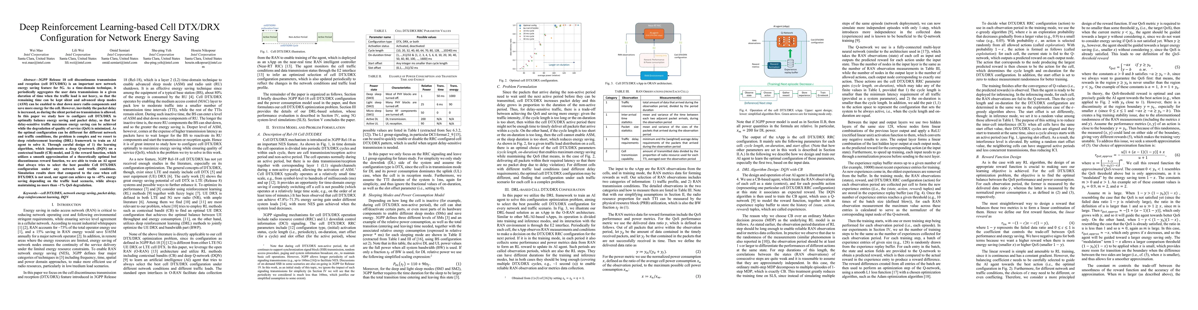 This research uses a combination of reinforcement learning and deep Q-networks to optimize cell DTX/DRX configuration for energy savings without compromising QoS.