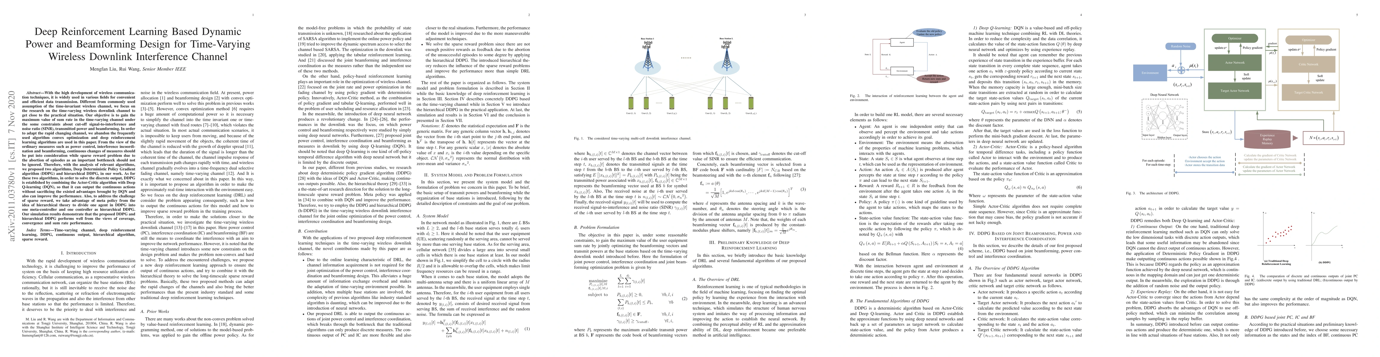 With the high development of wireless communication techniques, it is widely used in various fields for convenient and efficient data transmission. Different from commonly used assumption of the time-invariant wireless channel, we focus on the research on the time-varying wireless downlink channel to get close to the practical situation. Our objective is to gain the maximum value of sum rate in the time-varying channel under the some constraints about cut-off signal-to-interference and noise ratio (SINR), transmitted power and beamforming. In order to adapt the rapid changing channel, we abandon the frequently used algorithm convex optimization and deep reinforcement learning algorithms are used in this paper. From the view of the ordinary measures such as power control, interference incoordination and beamforming, continuous changes of measures should be put into consideration while sparse reward problem due to the abortion of episodes as an important bottleneck should not be ignored. Therefore, with the analysis of relevant algorithms, we proposed two algorithms, Deep Deterministic Policy Gradient algorithm (DDPG) and hierarchical DDPG, in our work. As for these two algorithms, in order to solve the discrete output, DDPG is established by combining the Actor-Critic algorithm with Deep Q-learning (DQN), so that it can output the continuous actions without sacrificing the existed advantages brought by DQN and also can improve the performance. Also, to address the challenge of sparse reward, we take advantage of meta policy from the idea of hierarchical theory to divide one agent in DDPG into one meta-controller and one controller as hierarchical DDPG. Our simulation results demonstrate that the proposed DDPG and hierarchical DDPG performs well from the views of coverage, convergence and sum rate performance.