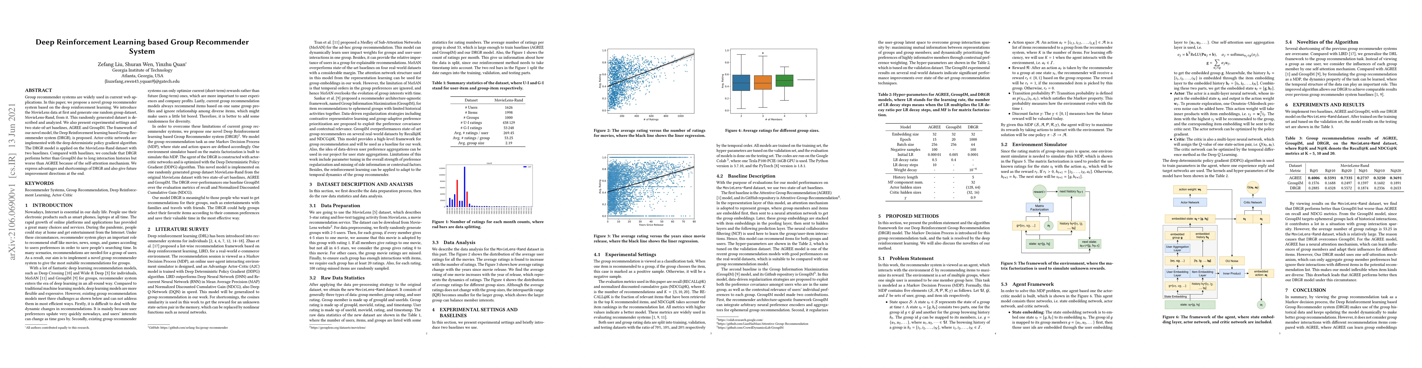 Group recommender systems are widely used in current web applications. In this paper, we propose a novel group recommender system based on the deep reinforcement learning. We introduce the MovieLens data at first and generate one random group dataset, MovieLens-Rand, from it. This randomly generated dataset is described and analyzed. We also present experimental settings and two state-of-art baselines, AGREE and GroupIM. The framework of our novel model, the Deep Reinforcement learning based Group Recommender system (DRGR), is proposed. Actor-critic networks are implemented with the deep deterministic policy gradient algorithm. The DRGR model is applied on the MovieLens-Rand dataset with two baselines. Compared with baselines, we conclude that DRGR performs better than GroupIM due to long interaction histories but worse than AGREE because of the self-attention mechanism. We express advantages and shortcomings of DRGR and also give future improvement directions at the end.