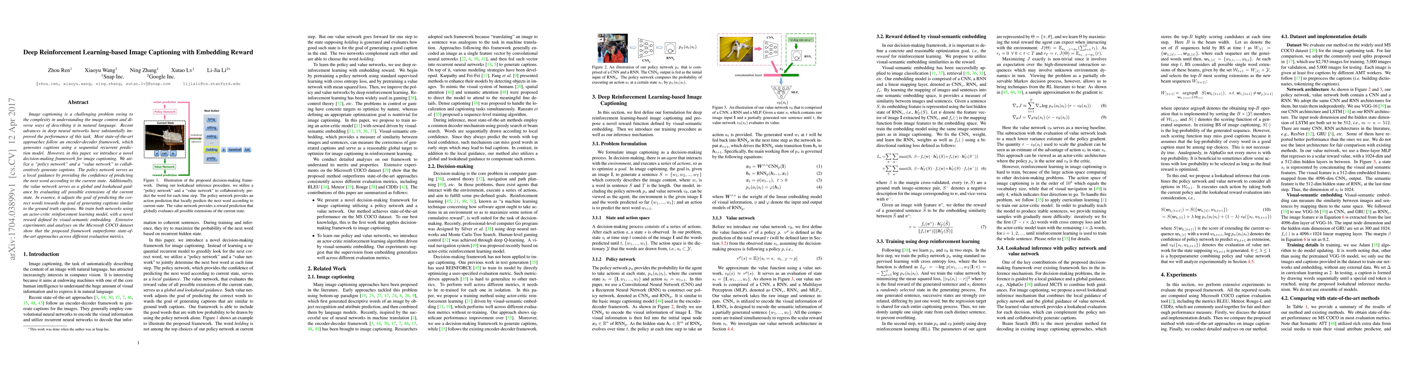 This paper proposes a novel reinforcement learning framework for image captioning using policy and value networks to generate captions. The actor-critic model trains these networks with a reward based on visual-semantic embedding, outperforming existing methods on the Microsoft COCO dataset.