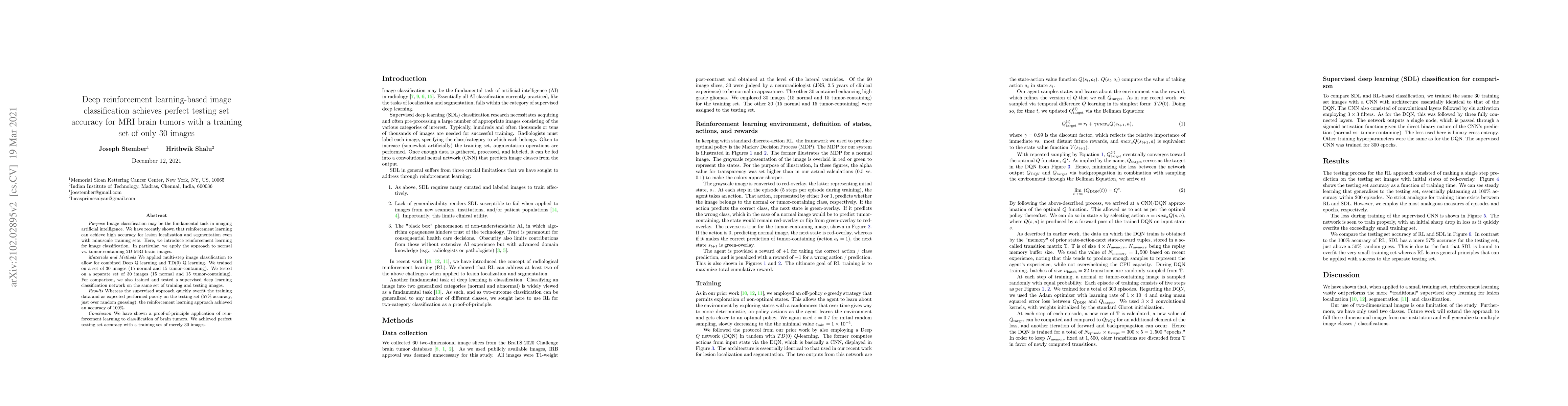 Purpose: Image classification may be the fundamental task in imaging artificial intelligence. We have recently shown that reinforcement learning can achieve high accuracy for lesion localization and segmentation even with minuscule training sets. Here, we introduce reinforcement learning for image classification. In particular, we apply the approach to normal vs. tumor-containing 2D MRI brain images. Materials and Methods: We applied multi-step image classification to allow for combined Deep Q learning and TD(0) Q learning. We trained on a set of 30 images (15 normal and 15 tumor-containing). We tested on a separate set of 30 images (15 normal and 15 tumor-containing). For comparison, we also trained and tested a supervised deep-learning classification network on the same set of training and testing images. Results: Whereas the supervised approach quickly overfit the training data and as expected performed poorly on the testing set (57% accuracy, just over random guessing), the reinforcement learning approach achieved an accuracy of 100%. Conclusion: We have shown a proof-of-principle application of reinforcement learning to the classification of brain tumors. We achieved perfect testing set accuracy with a training set of merely 30 images.
