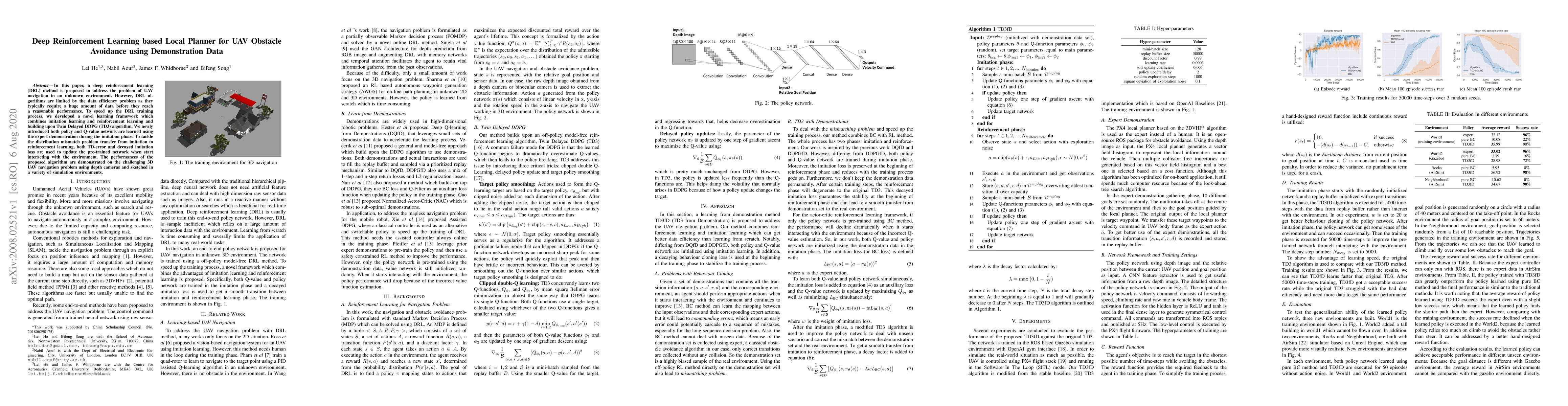 In this paper, a deep reinforcement learning (DRL) method is proposed to address the problem of UAV navigation in an unknown environment. However, DRL algorithms are limited by the data efficiency problem as they typically require a huge amount of data before they reach a reasonable performance. To speed up the DRL training process, we developed a novel learning framework which combines imitation learning and reinforcement learning and building upon Twin Delayed DDPG (TD3) algorithm. We newly introduced both policy and Q-value network are learned using the expert demonstration during the imitation phase. To tackle the distribution mismatch problem transfer from imitation to reinforcement learning, both TD-error and decayed imitation loss are used to update the pre-trained network when start interacting with the environment. The performances of the proposed algorithm are demonstrated on the challenging 3D UAV navigation problem using depth cameras and sketched in a variety of simulation environments.