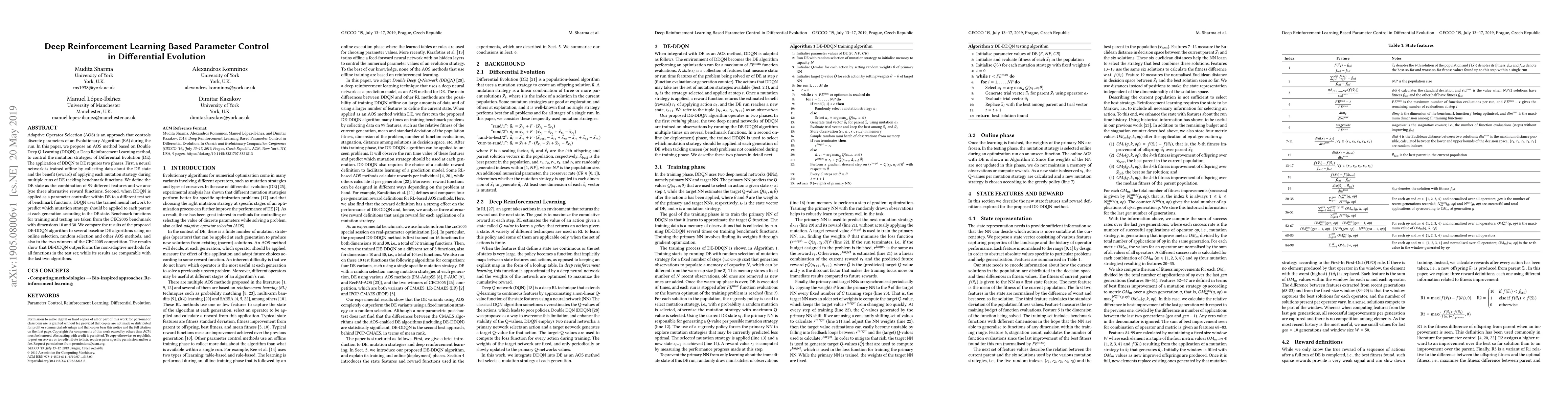 This paper proposes a Double Deep Q-Learning (DDQN) method for adaptive operator selection in Differential Evolution (DE) to control mutation strategies. The DDQN model is trained offline using benchmark functions, and then applied online to select optimal mutation strategies based on the DE state, outperforming non-adaptive baselines on test functions.