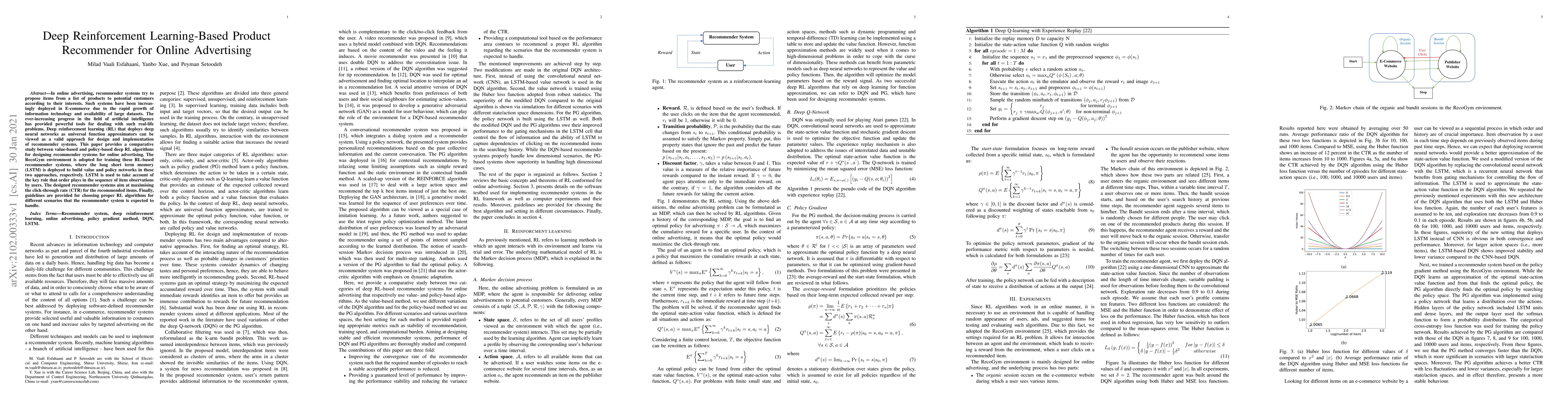 This paper compares value-based and policy-based deep reinforcement learning algorithms for developing recommender systems in online advertising, using LSTM networks to account for item sequence order. The aim is to maximize click-through rates, with guidelines for algorithm selection provided.