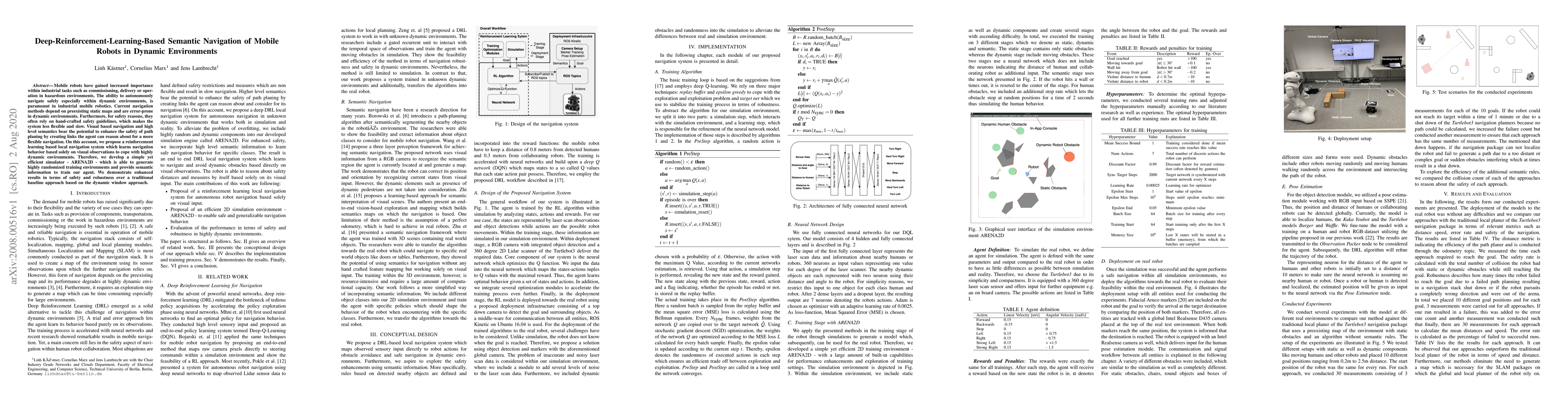 This paper proposes a deep-reinforcement-learning-based navigation system for mobile robots to autonomously navigate in dynamic environments using visual observations and semantic information. The developed ARENA2D simulator enhances the agent's flexibility and safety, demonstrating superior performance compared to traditional dynamic window approach.