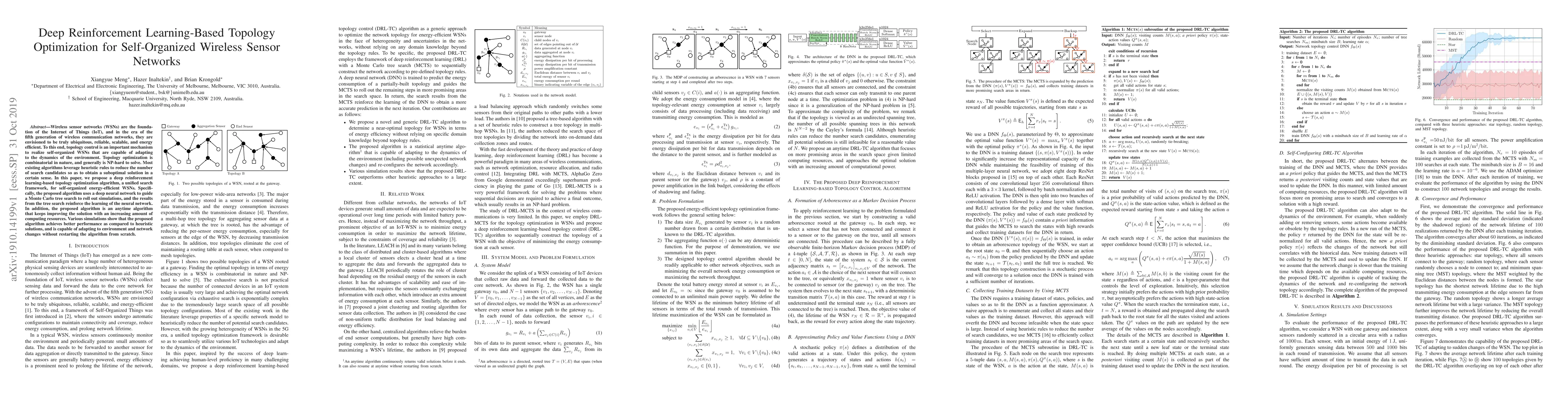 This paper proposes a deep reinforcement learning-based algorithm for optimizing the topology of self-organized wireless sensor networks, using a deep neural network to guide Monte Carlo tree search. The algorithm improves continuously with more resources, outperforming heuristic methods and adapting to dynamic network changes.