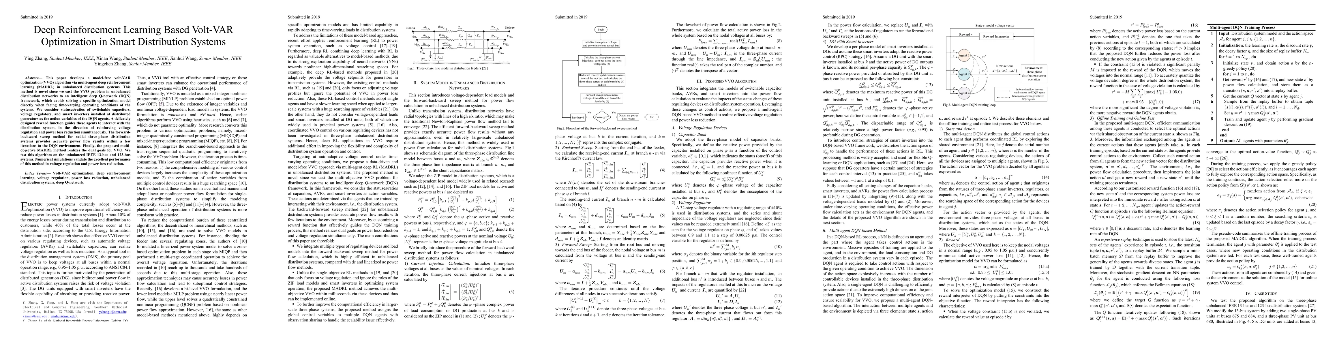 This paper proposes a model-free volt-VAR optimization algorithm using multi-agent deep reinforcement learning to manage voltage regulation and power loss in unbalanced distribution systems. The method employs an intelligent deep Q-network framework to dynamically adjust switchable capacitors, voltage regulators, and smart inverters, achieving optimal performance validated on IEEE 13-bus and 123-bus systems.