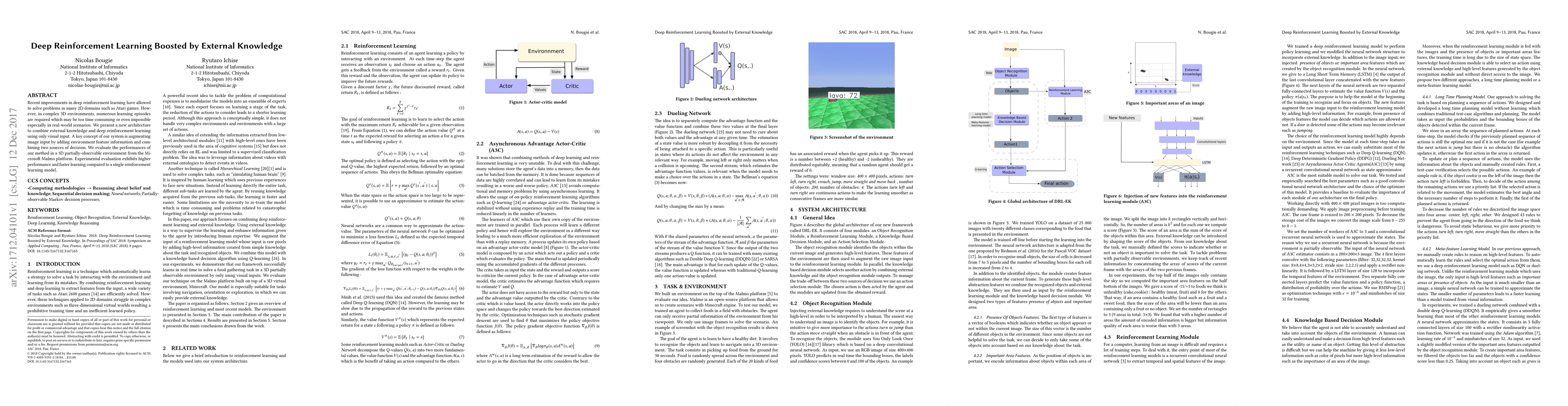 This paper proposes a new architecture that combines external knowledge with deep reinforcement learning to improve performance in complex 3D environments. By augmenting visual input with environment feature information, the method achieves faster learning and higher performance compared to traditional reinforcement learning alone, as demonstrated in a 3D partially-observable environment.