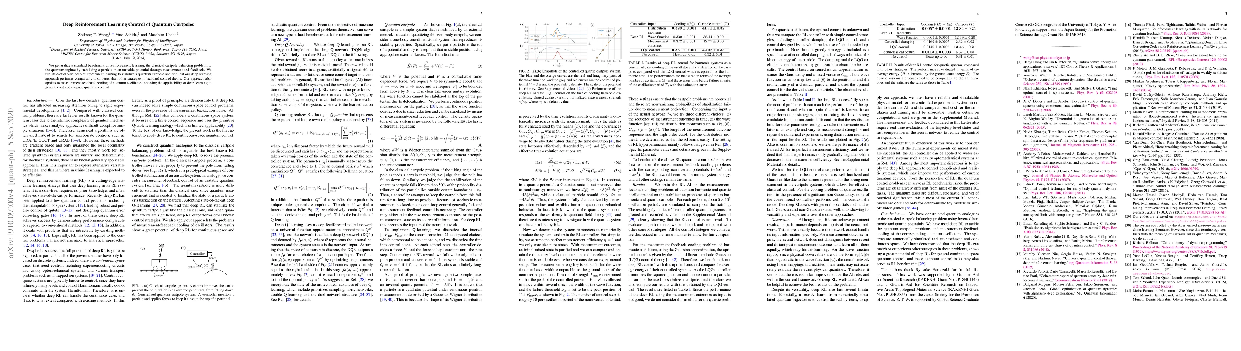 This paper explores deep reinforcement learning to stabilize a quantum cartpole in an unstable potential, demonstrating its effectiveness comparable to or surpassing traditional control methods, and extending its applicability to quantum oscillator cooling.