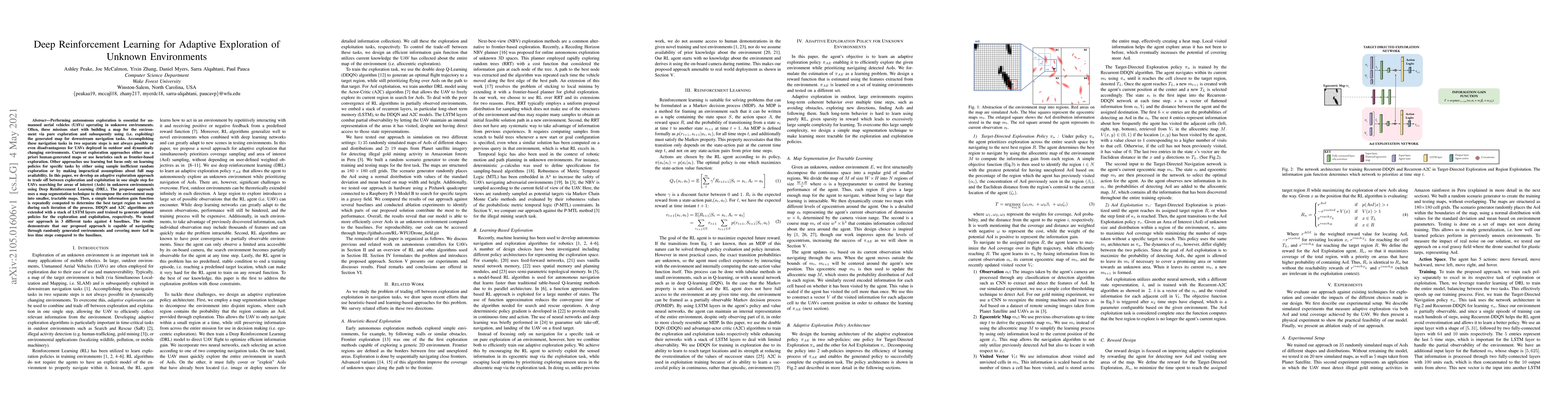 This paper proposes a Deep Reinforcement Learning (DRL) approach for adaptive exploration in unknown environments for UAVs, integrating exploration and exploitation in a single step. The method uses map segmentation and information gain to identify optimal areas of interest, employing DDQN and A2C with LSTM layers for policy generation, and outperforms baselines in covering areas of interest in less time.