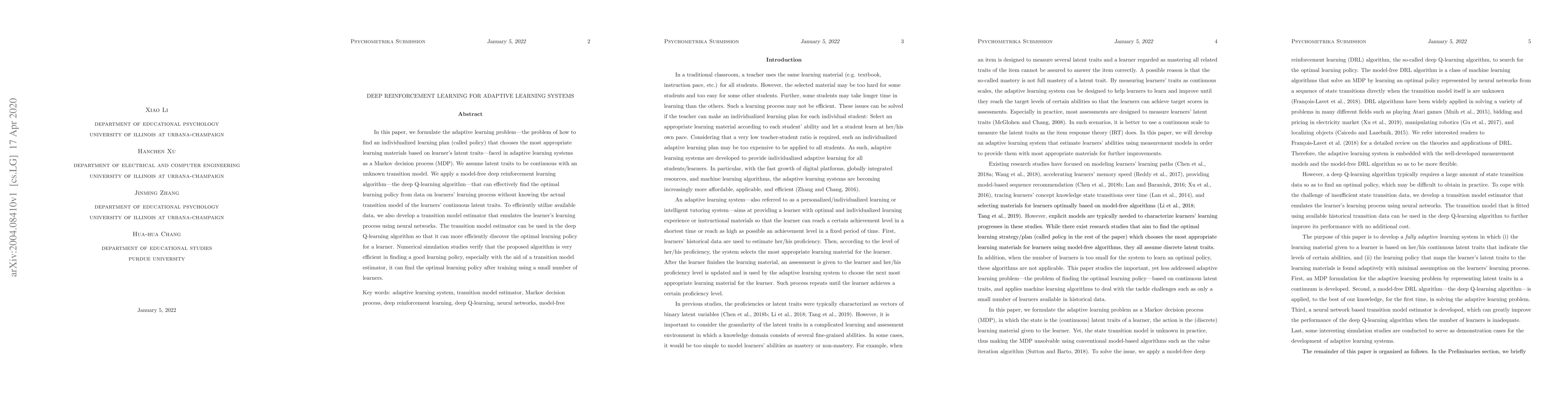 This paper proposes a deep reinforcement learning approach to adaptive learning systems, using deep Q-learning to find optimal individualized learning plans without requiring knowledge of the learners' latent traits transition model. A neural network-based transition model estimator is developed to enhance the algorithm's efficiency, and simulations show it can effectively discover optimal policies with minimal training data.
