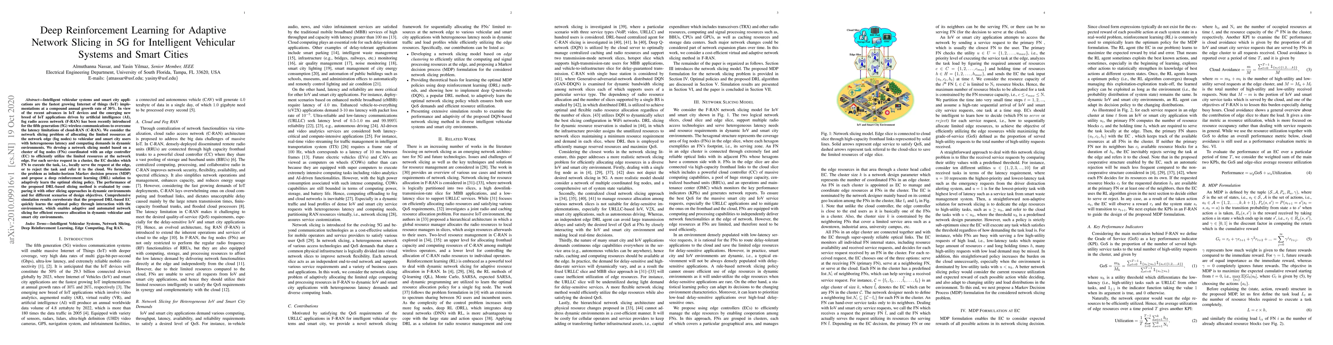 This paper proposes a deep reinforcement learning (DRL) solution for adaptive network slicing in 5G's fog radio access networks (F-RAN) to efficiently allocate resources for intelligent vehicular systems and smart city applications. The developed DRL-based edge controller learns optimal slicing policies to dynamically serve or defer tasks based on varying latency and computing demands.