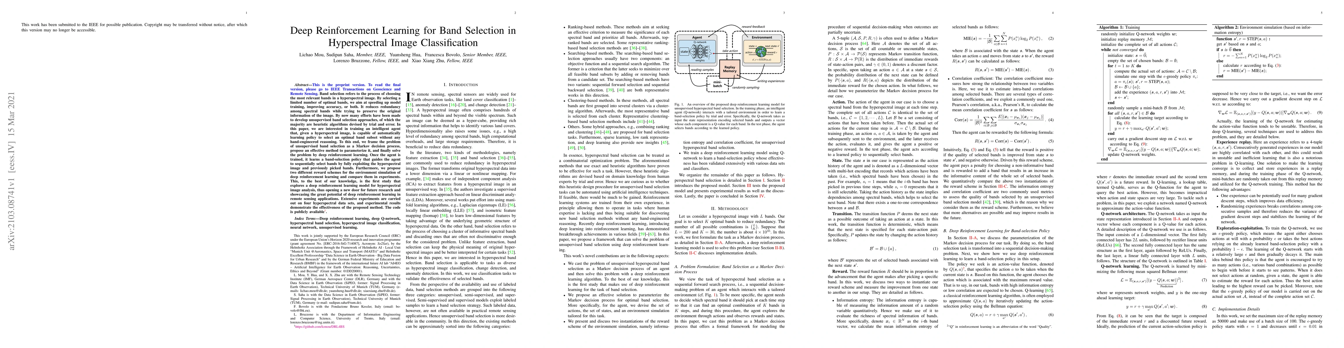 This paper proposes a deep reinforcement learning approach to automate the selection of optimal bands in hyperspectral images, framing the problem as a Markov decision process. The method trains an intelligent agent to sequentially choose bands, demonstrating improved performance over heuristic algorithms.