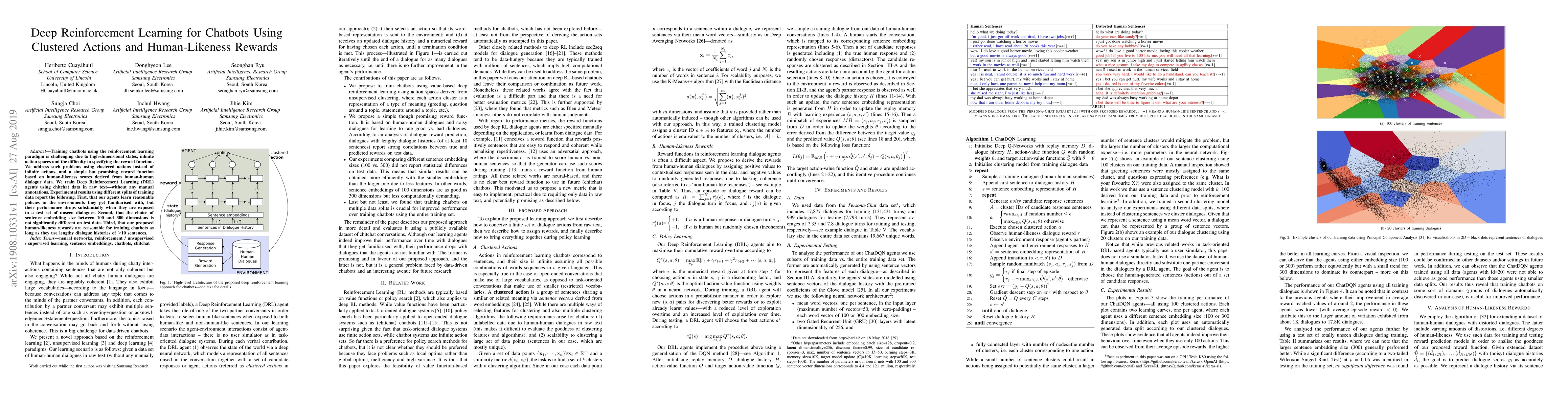 This paper explores Deep Reinforcement Learning for training chatbots using clustered actions and human-likeness rewards derived from human-human dialogue data. The study finds that while agents learn well in familiar environments, performance drops with unseen dialogues, and sentence embedding sizes between 100 and 300 dimensions show no significant differences.