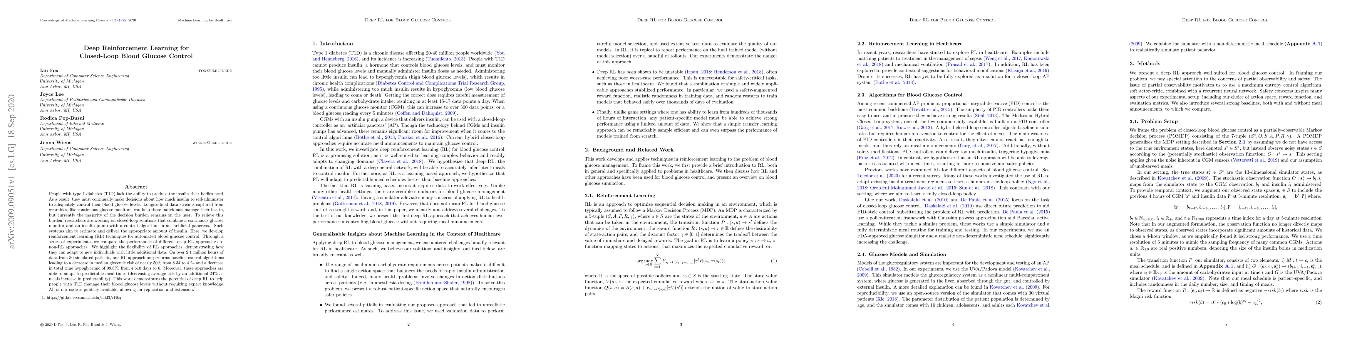 This paper develops deep reinforcement learning techniques for automated blood glucose control in type 1 diabetes management, showing that RL approaches outperform traditional control algorithms by reducing glycemic risk and hypoglycemic time significantly. The RL methods also adapt well to individual variability and predictable meal times.