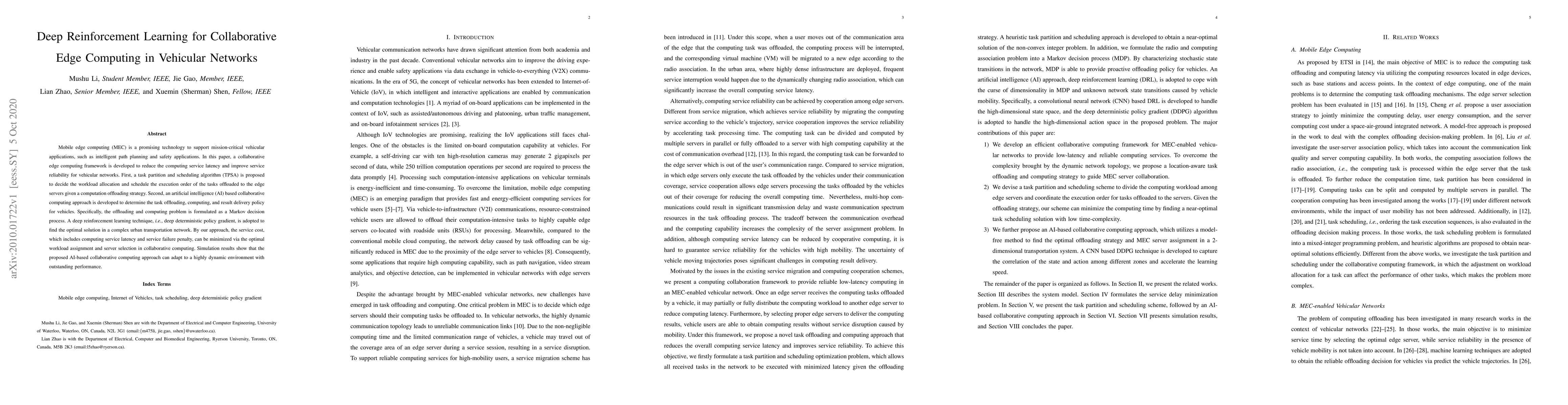 This paper proposes a deep reinforcement learning framework for collaborative edge computing in vehicular networks to minimize service cost by optimizing task offloading and scheduling. Simulation results demonstrate superior performance in adapting to dynamic urban environments.