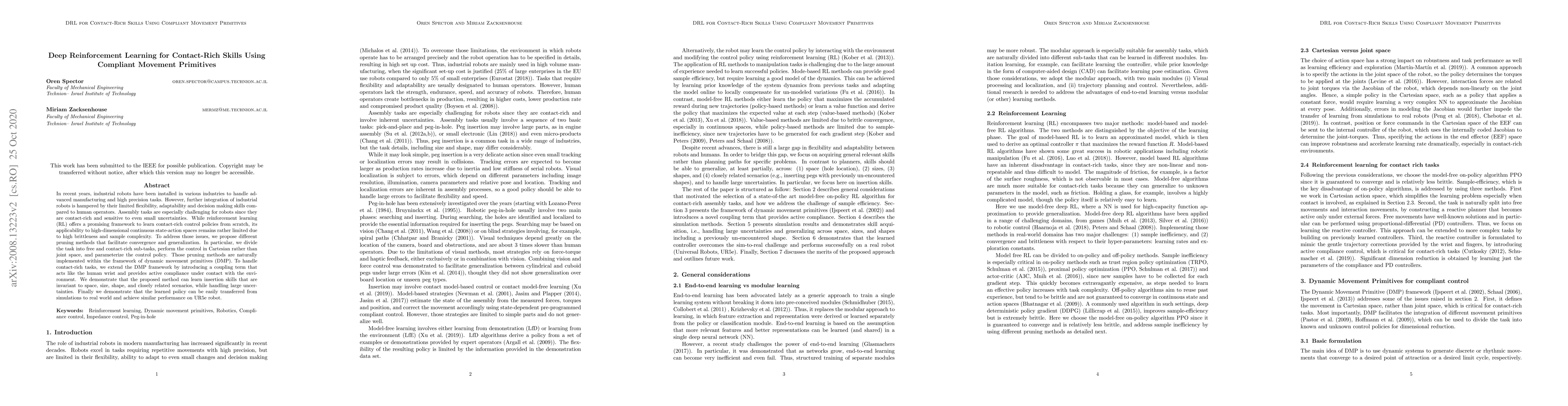 In recent years, industrial robots have been installed in various industries to handle advanced manufacturing and high precision tasks. However, further integration of industrial robots is hampered by their limited flexibility, adaptability and decision making skills compared to human operators. Assembly tasks are especially challenging for robots since they are contact-rich and sensitive to even small uncertainties. While reinforcement learning (RL) offers a promising framework to learn contact-rich control policies from scratch, its applicability to high-dimensional continuous state-action spaces remains rather limited due to high brittleness and sample complexity. To address those issues, we propose different pruning methods that facilitate convergence and generalization. In particular, we divide the task into free and contact-rich sub-tasks, perform the control in Cartesian rather than joint space, and parameterize the control policy. Those pruning methods are naturally implemented within the framework of dynamic movement primitives (DMP). To handle contact-rich tasks, we extend the DMP framework by introducing a coupling term that acts like the human wrist and provides active compliance under contact with the environment. We demonstrate that the proposed method can learn insertion skills that are invariant to space, size, shape, and closely related scenarios, while handling large uncertainties. Finally we demonstrate that the learned policy can be easily transferred from simulations to real world and achieve similar performance on UR5e robot.