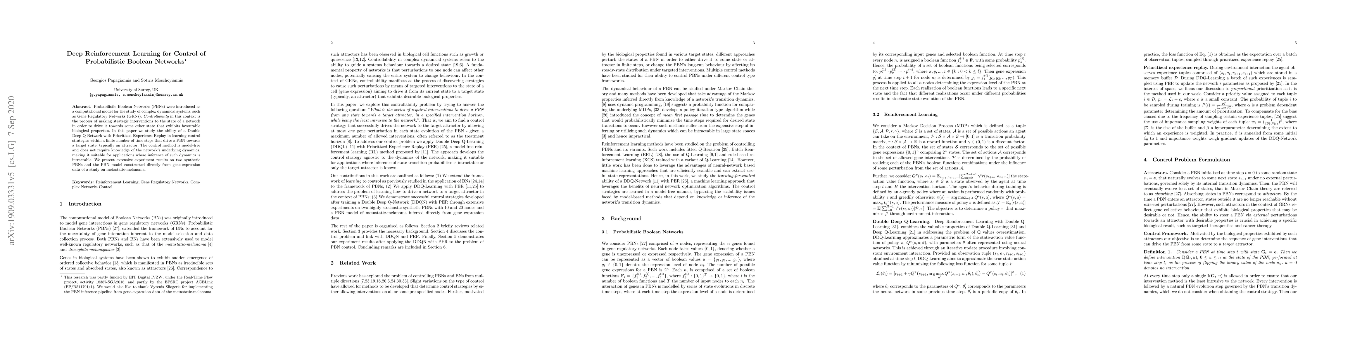 This paper explores the use of Double Deep Q-Networks with Prioritized Experience Replay for model-free control of Probabilistic Boolean Networks, demonstrating its effectiveness in driving networks towards target states without requiring knowledge of their underlying dynamics. Experiments show successful application on synthetic networks and a melanoma gene-expression model.