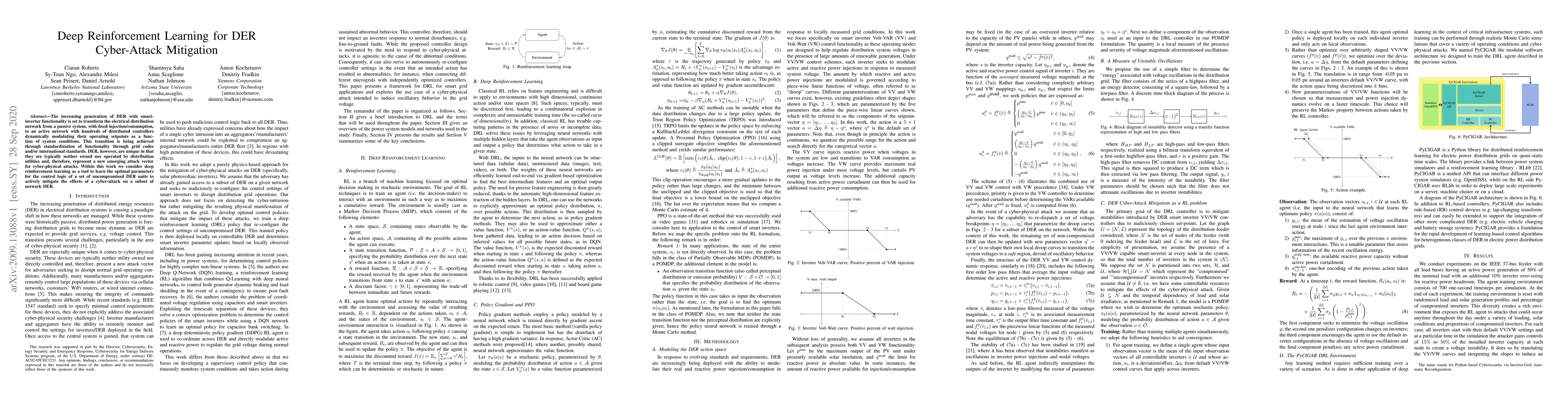The increasing penetration of DER with smart-inverter functionality is set to transform the electrical distribution network from a passive system, with fixed injection/consumption, to an active network with hundreds of distributed controllers dynamically modulating their operating setpoints as a function of system conditions. This transition is being achieved through standardization of functionality through grid codes and/or international standards. DER, however, are unique in that they are typically neither owned nor operated by distribution utilities and, therefore, represent a new emerging attack vector for cyber-physical attacks. Within this work we consider deep reinforcement learning as a tool to learn the optimal parameters for the control logic of a set of uncompromised DER units to actively mitigate the effects of a cyber-attack on a subset of network DER.