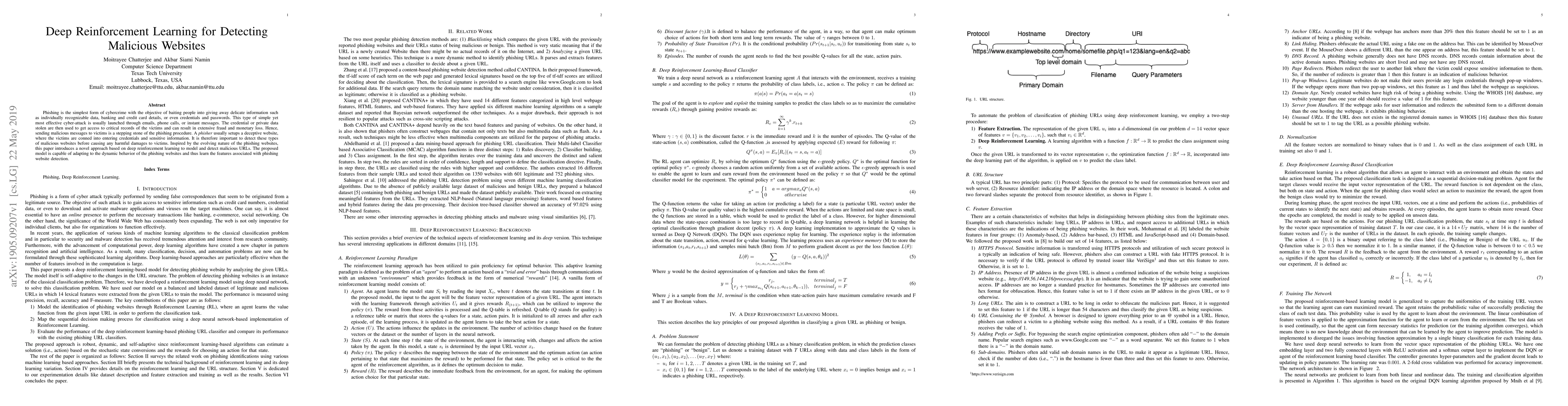 This paper proposes a deep reinforcement learning approach to detect malicious websites used in phishing attacks. The model adapts to the evolving nature of phishing sites, learning features that distinguish them from legitimate sites to prevent fraud and data theft.
