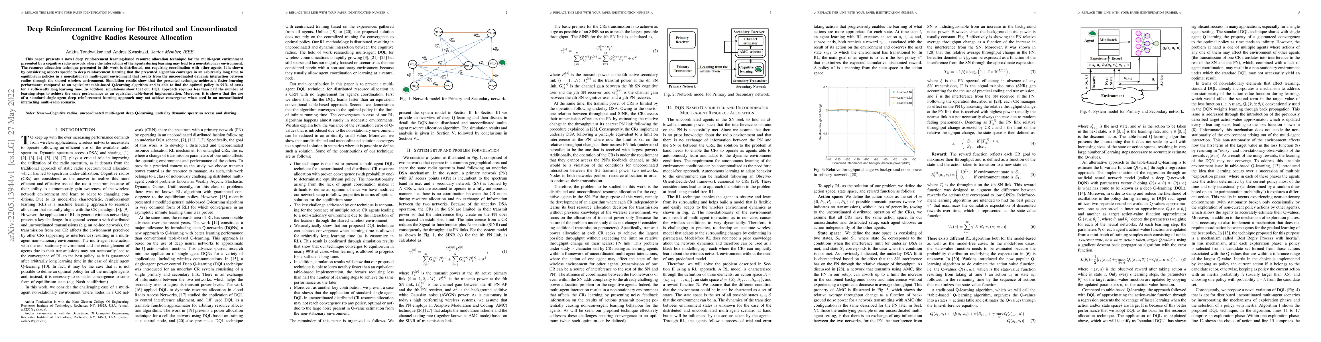 This paper introduces a deep reinforcement learning technique for resource allocation in uncoordinated cognitive radio networks, demonstrating its convergence in non-stationary environments and superior performance over table-based Q-learning. The distributed algorithm achieves optimal policies in most cases and requires fewer learning steps.