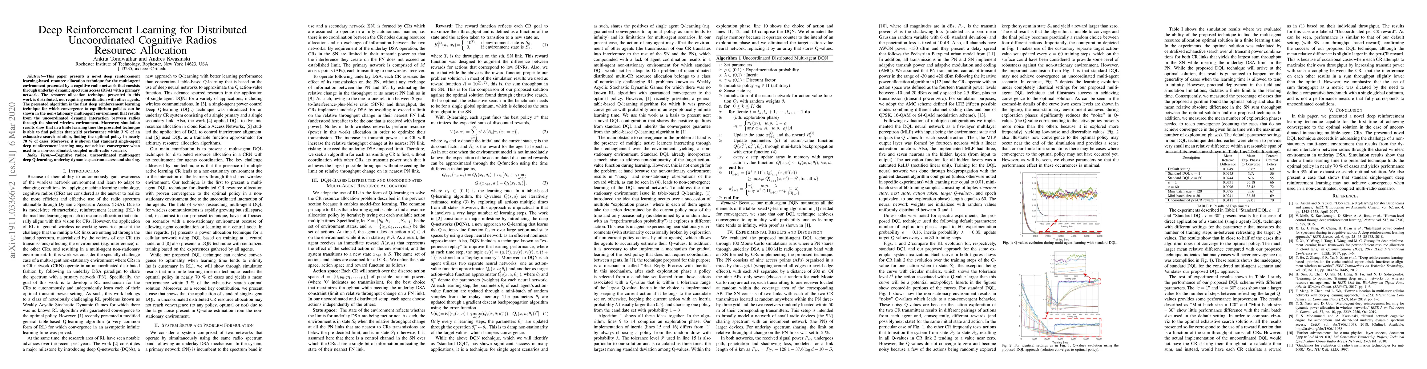 This paper introduces a distributed deep reinforcement learning algorithm for resource allocation in cognitive radio networks, demonstrating convergence in a non-stationary multi-agent environment without coordination. Simulation results indicate the method finds near-optimal policies in nearly 70% of cases.