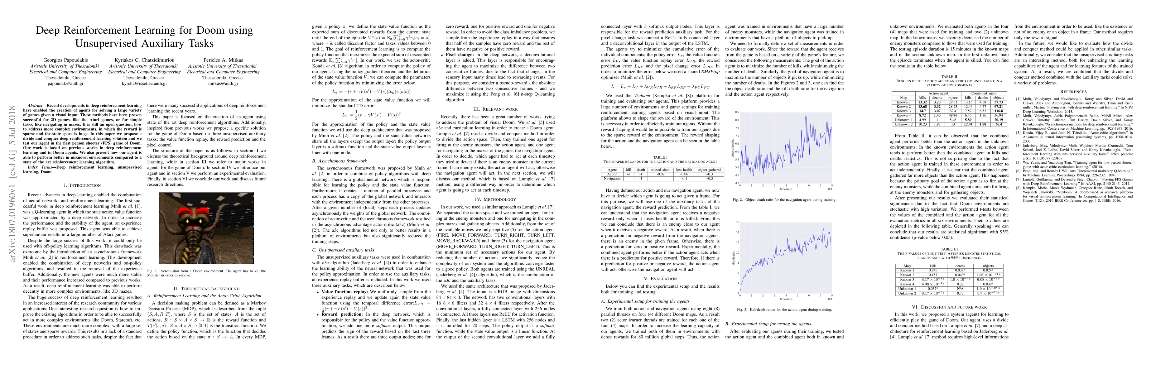This paper proposes a deep reinforcement learning approach using unsupervised auxiliary tasks to tackle the complex environment of the FPS game Doom. The method demonstrates improved performance in unknown environments compared to existing reinforcement learning algorithms.
