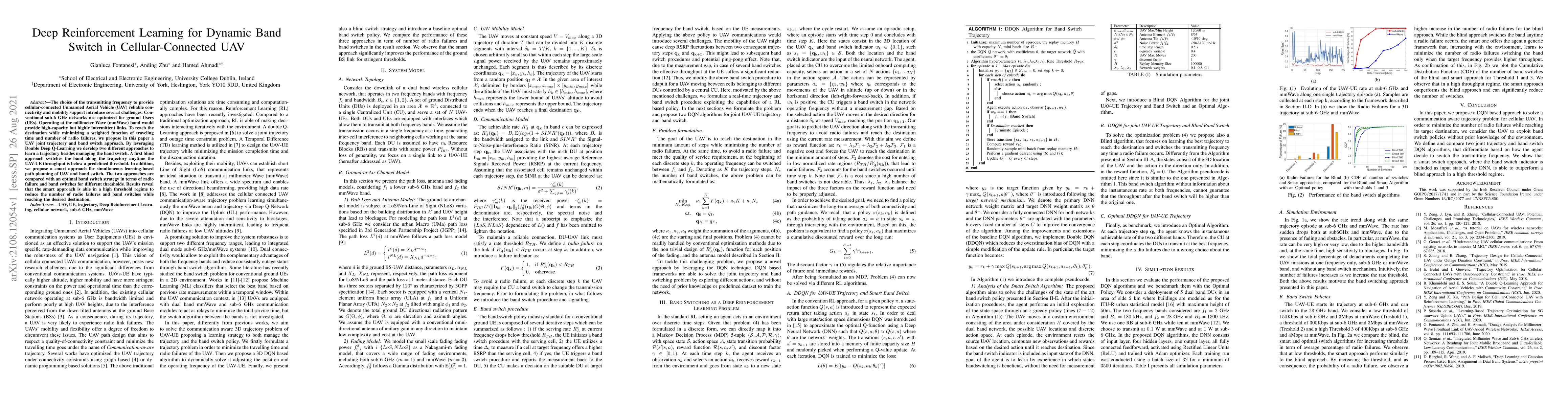 The choice of the transmitting frequency to provide cellular-connected Unmanned Aerial Vehicle (UAV) reliable connectivity and mobility support introduce several challenges. Conventional sub-6 GHz networks are optimized for ground Users (UEs). Operating at the millimeter Wave (mmWave) band would provide high-capacity but highly intermittent links. To reach the destination while minimizing a weighted function of traveling time and number of radio failures, we propose in this paper a UAV joint trajectory and band switch approach. By leveraging Double Deep Q-Learning we develop two different approaches to learn a trajectory besides managing the band switch. A first blind approach switches the band along the trajectory anytime the UAV-UE throughput is below a predefined threshold. In addition, we propose a smart approach for simultaneous learning-based path planning of UAV and band switch. The two approaches are compared with an optimal band switch strategy in terms of radio failure and band switches for different thresholds. Results reveal that the smart approach is able in a high threshold regime to reduce the number of radio failures and band switches while reaching the desired destination.
