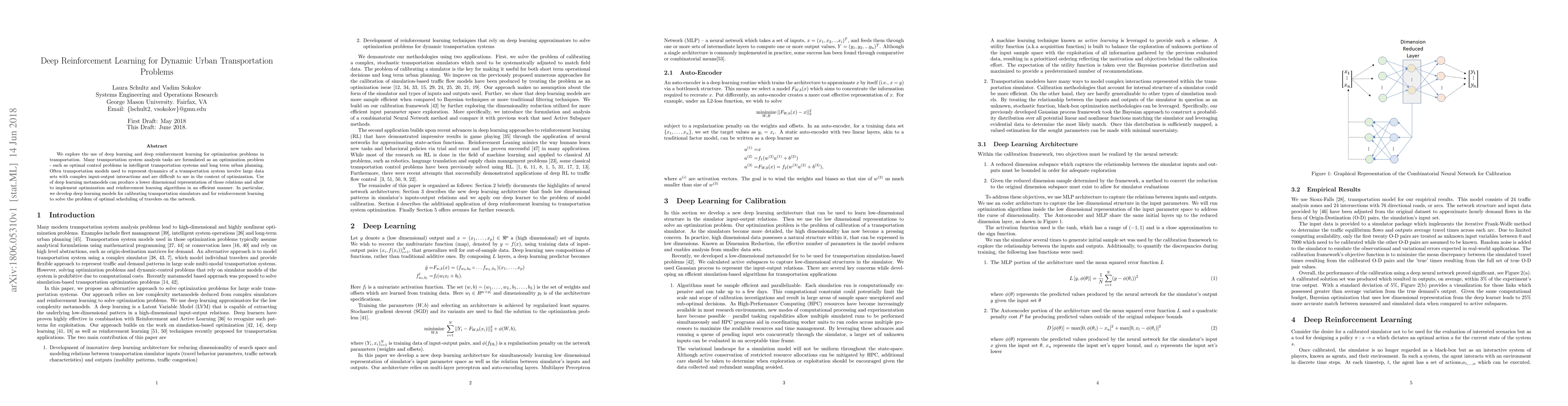 We explore the use of deep learning and deep reinforcement learning for optimization problems in transportation. Many transportation system analysis tasks are formulated as an optimization problem - such as optimal control problems in intelligent transportation systems and long term urban planning. Often transportation models used to represent dynamics of a transportation system involve large data sets with complex input-output interactions and are difficult to use in the context of optimization. Use of deep learning metamodels can produce a lower dimensional representation of those relations and allow to implement optimization and reinforcement learning algorithms in an efficient manner. In particular, we develop deep learning models for calibrating transportation simulators and for reinforcement learning to solve the problem of optimal scheduling of travelers on the network.