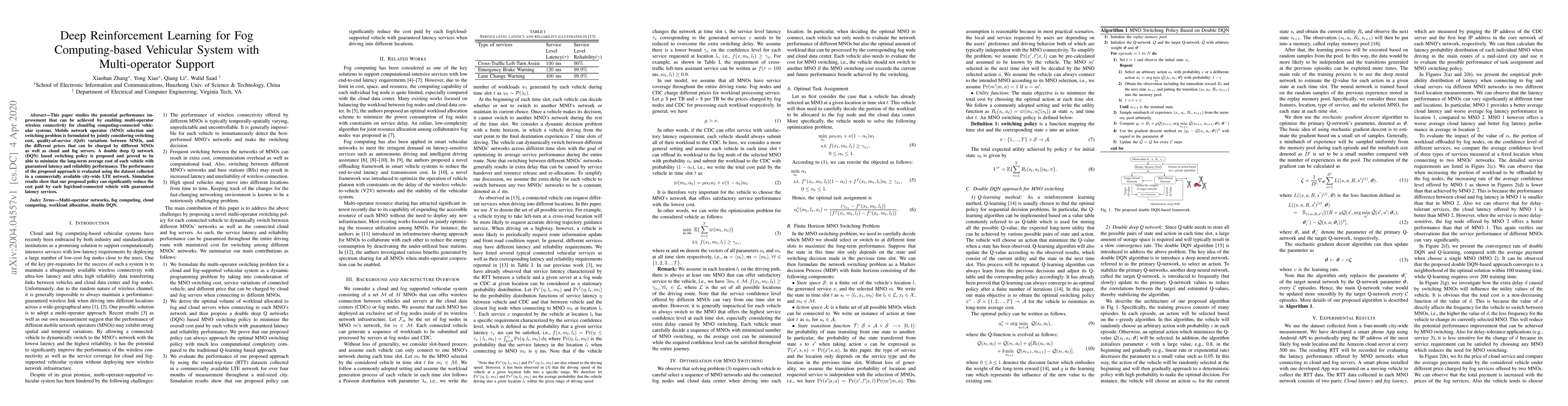 This paper proposes a deep reinforcement learning approach using a double deep Q network to optimize mobile network operator selection for fog computing-based vehicular systems, achieving significant cost reduction while maintaining latency and reliability. Simulation results demonstrate improved performance over existing methods.
