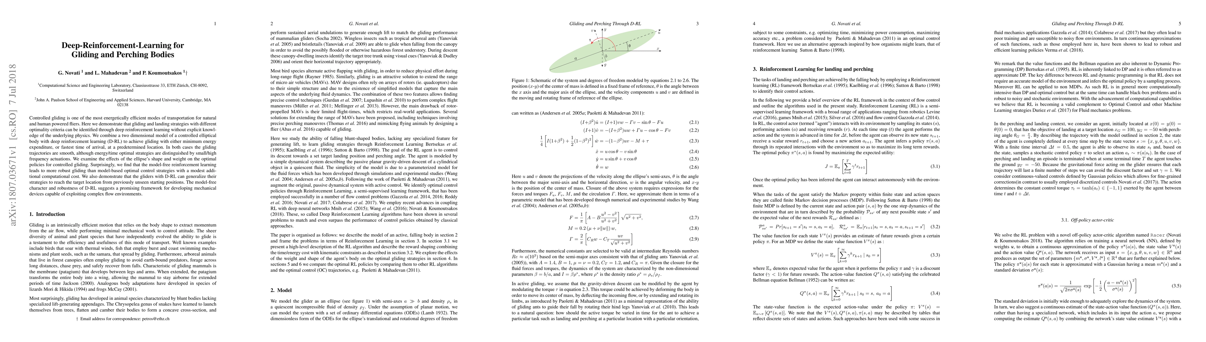 This research uses deep reinforcement learning to identify optimal gliding and landing strategies for an elliptical body, achieving either minimum energy or fastest arrival without explicit physics knowledge. The study finds that model-free reinforcement learning is more robust and allows for generalization to new starting positions compared to model-based strategies.