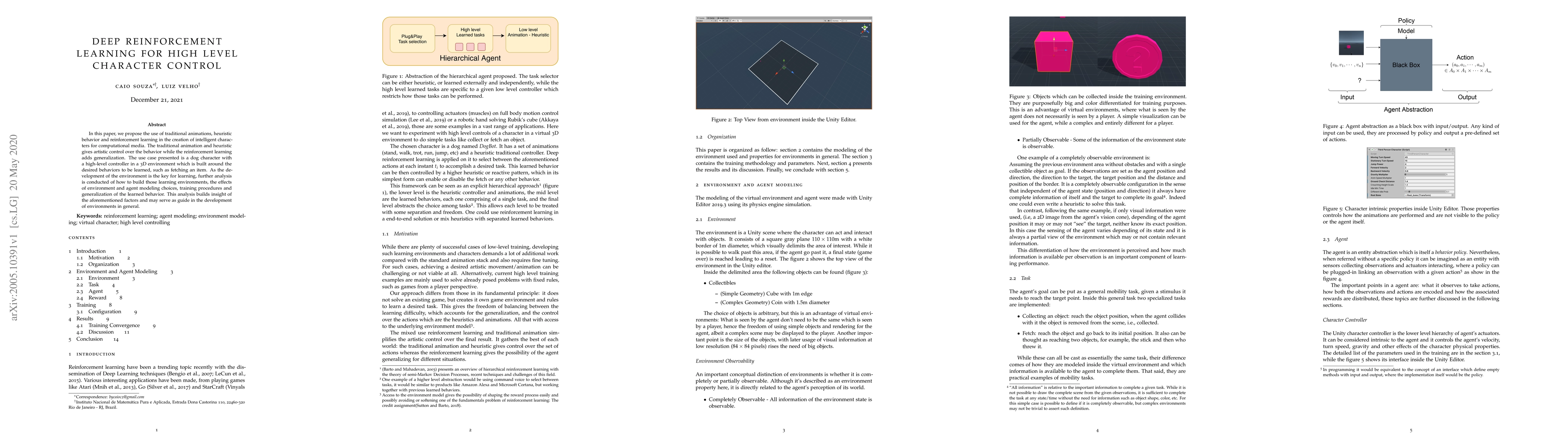 In this paper, we propose the use of traditional animations, heuristic behavior and reinforcement learning in the creation of intelligent characters for computational media. The traditional animation and heuristic gives artistic control over the behavior while the reinforcement learning adds generalization. The use case presented is a dog character with a high-level controller in a 3D environment which is built around the desired behaviors to be learned, such as fetching an item. As the development of the environment is the key for learning, further analysis is conducted of how to build those learning environments, the effects of environment and agent modeling choices, training procedures and generalization of the learned behavior. This analysis builds insight of the aforementioned factors and may serve as guide in the development of environments in general.