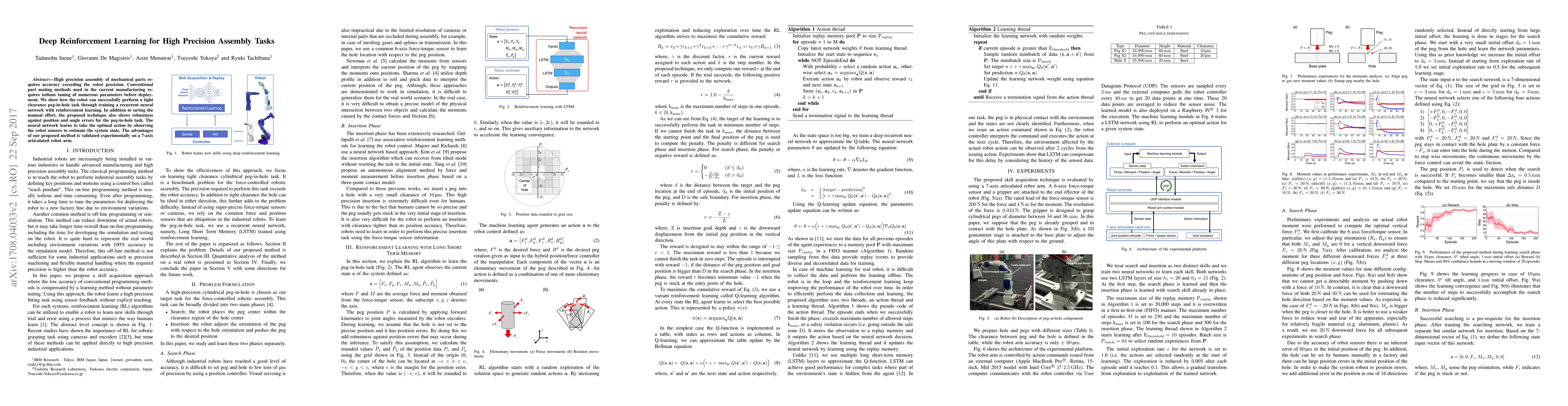 This paper proposes a deep reinforcement learning approach using a recurrent neural network to enable a robot to perform high precision peg-in-hole assembly tasks without extensive manual parameter tuning. The method demonstrates robustness to position and angle errors and is validated experimentally on a 7-axis articulated robot arm.