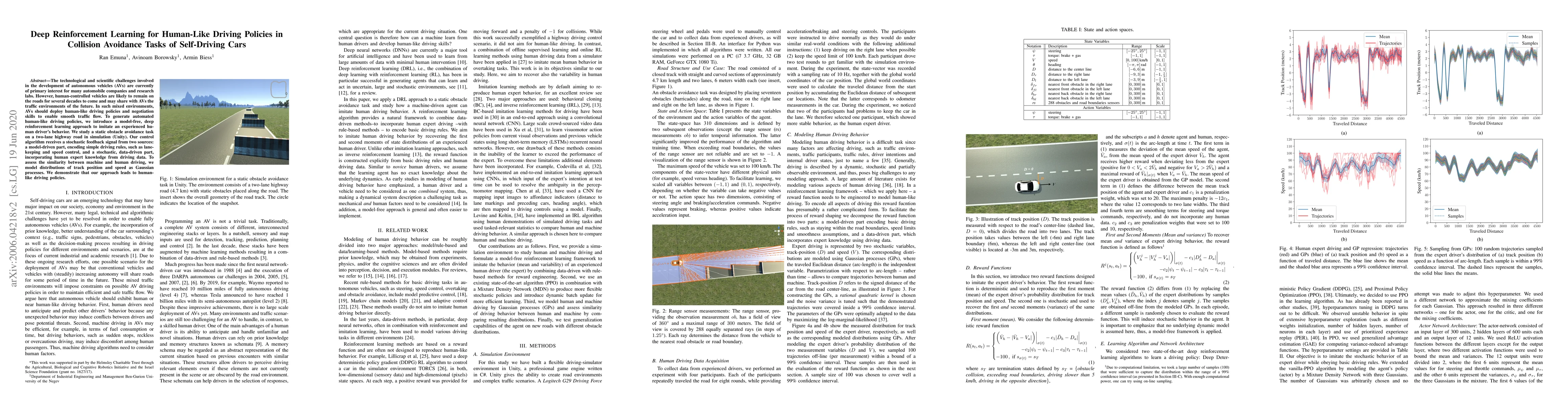 The technological and scientific challenges involved in the development of autonomous vehicles (AVs) are currently of primary interest for many automobile companies and research labs. However, human-controlled vehicles are likely to remain on the roads for several decades to come and may share with AVs the traffic environments of the future. In such mixed environments, AVs should deploy human-like driving policies and negotiation skills to enable smooth traffic flow. To generate automated human-like driving policies, we introduce a model-free, deep reinforcement learning approach to imitate an experienced human driver's behavior. We study a static obstacle avoidance task on a two-lane highway road in simulation (Unity). Our control algorithm receives a stochastic feedback signal from two sources: a model-driven part, encoding simple driving rules, such as lane-keeping and speed control, and a stochastic, data-driven part, incorporating human expert knowledge from driving data. To assess the similarity between machine and human driving, we model distributions of track position and speed as Gaussian processes. We demonstrate that our approach leads to human-like driving policies.