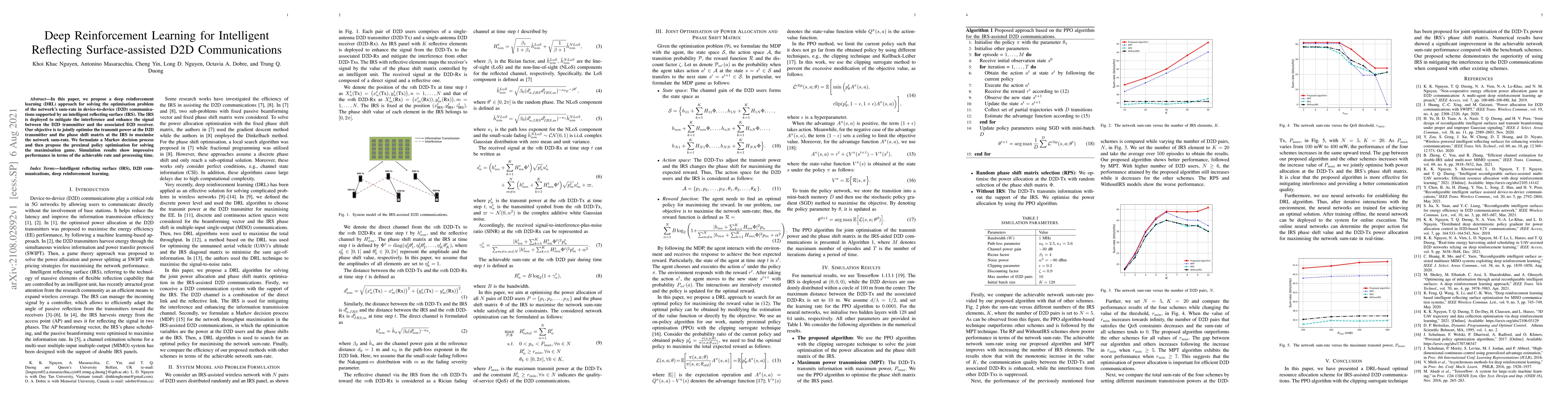 This paper proposes a deep reinforcement learning approach to optimize the sum-rate in D2D communications enhanced by an intelligent reflecting surface (IRS). The method jointly optimizes transmit power and IRS phase shifts to maximize network performance, demonstrating significant improvements in achievable rate and processing efficiency.