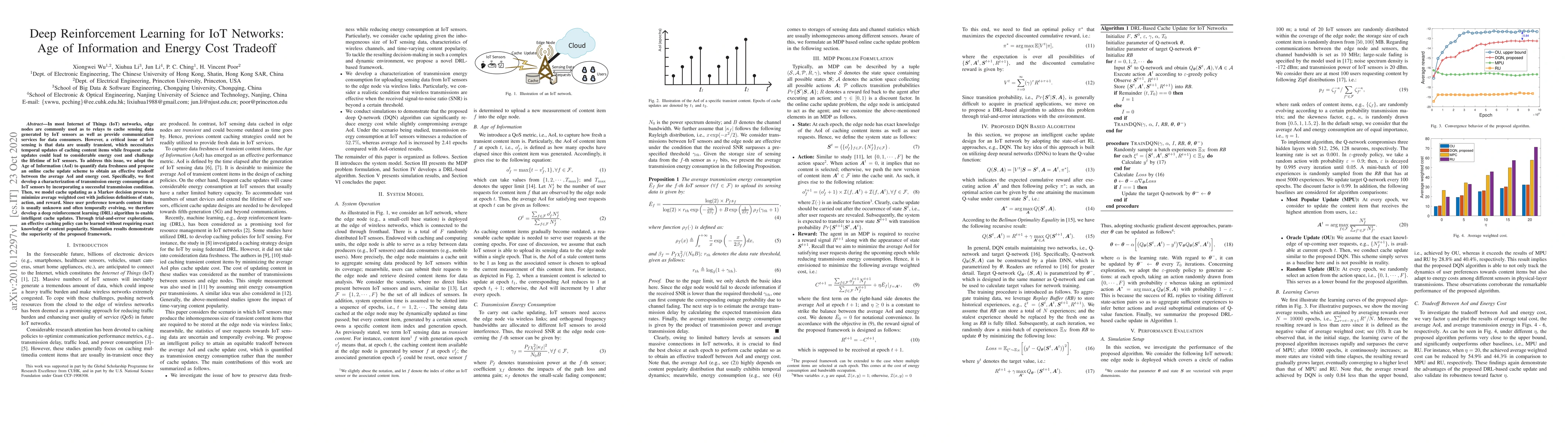 This paper proposes a deep reinforcement learning approach to optimize cache update strategies in IoT networks, balancing the Age of Information (AoI) and energy cost. The authors develop a Markov decision process model and a DRL algorithm to learn effective caching policies without precise knowledge of content popularity, demonstrating improved performance through simulations.