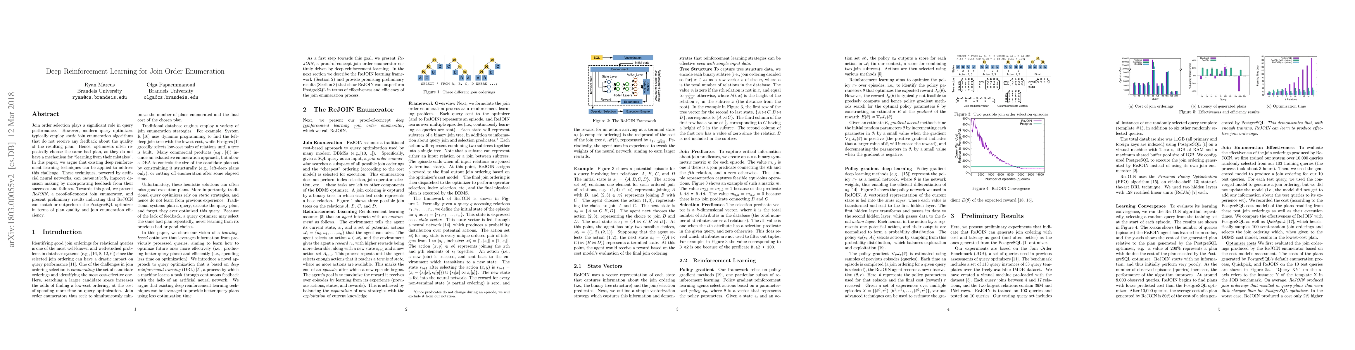 This paper proposes using deep reinforcement learning to dynamically improve join order selection in database query optimizers, introducing ReJOIN as a proof-of-concept. Preliminary results suggest that this approach can match or outperform traditional static methods in plan quality and enumeration efficiency.