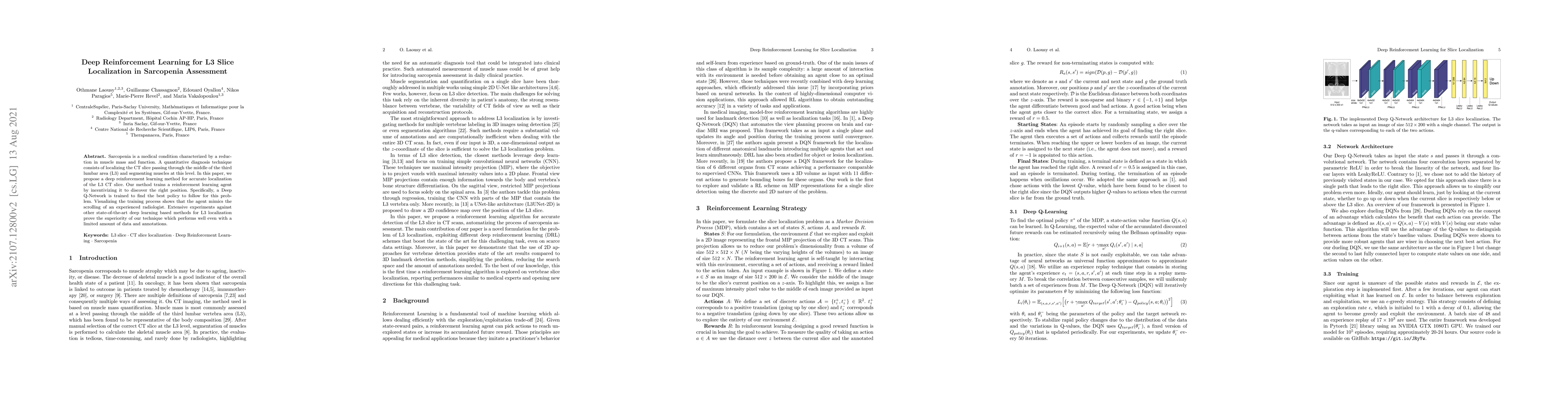 This paper proposes a deep reinforcement learning method using a Deep Q-Network to accurately localize the L3 CT slice for sarcopenia diagnosis. The trained agent outperforms other state-of-the-art deep learning methods, demonstrating effectiveness even with limited data.
