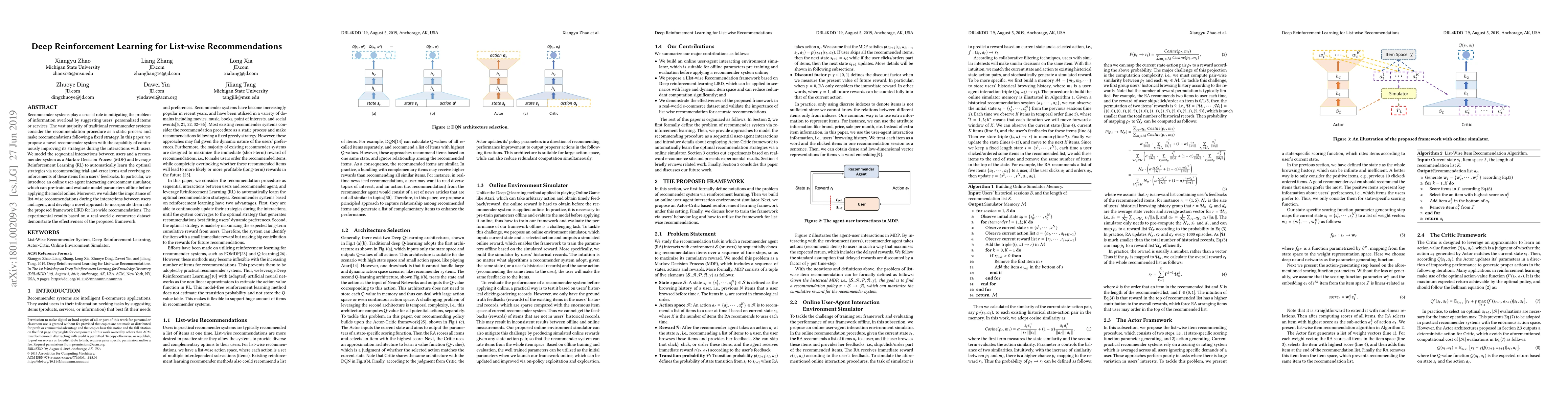 Recommender systems play a crucial role in mitigating the problem of information overload by suggesting users' personalized items or services. The vast majority of traditional recommender systems consider the recommendation procedure as a static process and make recommendations following a fixed strategy. In this paper, we propose a novel recommender system with the capability of continuously improving its strategies during the interactions with users. We model the sequential interactions between users and a recommender system as a Markov Decision Process (MDP) and leverage Reinforcement Learning (RL) to automatically learn the optimal strategies via recommending trial-and-error items and receiving reinforcements of these items from users' feedbacks. In particular, we introduce an online user-agent interacting environment simulator, which can pre-train and evaluate model parameters offline before applying the model online. Moreover, we validate the importance of list-wise recommendations during the interactions between users and agent, and develop a novel approach to incorporate them into the proposed framework LIRD for list-wide recommendations. The experimental results based on a real-world e-commerce dataset demonstrate the effectiveness of the proposed framework.