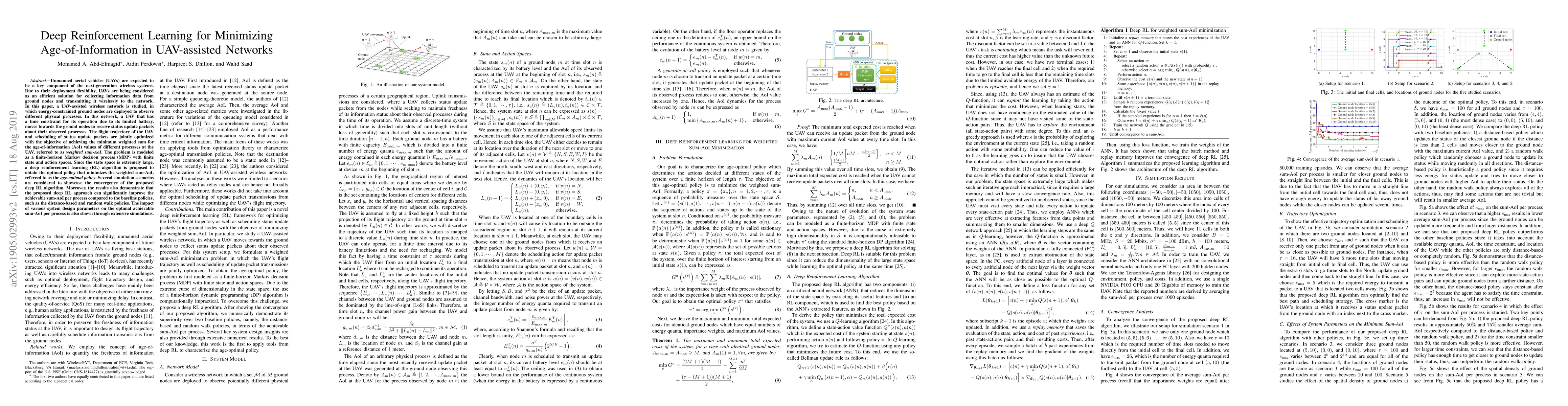 This paper proposes a deep reinforcement learning algorithm to optimize UAV flight trajectories and packet scheduling in UAV-assisted networks to minimize the weighted sum of age-of-information (AoI) for energy-constrained ground nodes. The approach outperforms baseline methods, demonstrating significant improvements in sum-AoI per process.