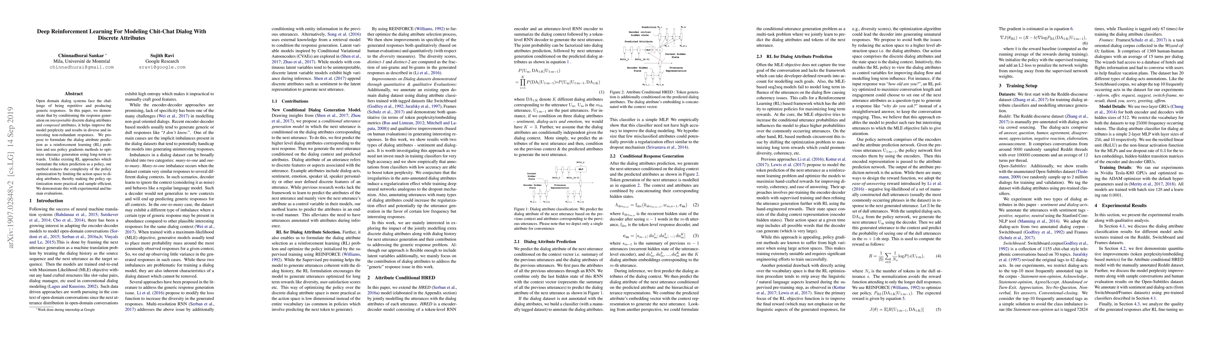 Open domain dialog systems face the challenge of being repetitive and producing generic responses. In this paper, we demonstrate that by conditioning the response generation on interpretable discrete dialog attributes and composed attributes, it helps improve the model perplexity and results in diverse and interesting non-redundant responses. We propose to formulate the dialog attribute prediction as a reinforcement learning (RL) problem and use policy gradients methods to optimize utterance generation using long-term rewards. Unlike existing RL approaches which formulate the token prediction as a policy, our method reduces the complexity of the policy optimization by limiting the action space to dialog attributes, thereby making the policy optimization more practical and sample efficient. We demonstrate this with experimental and human evaluations.