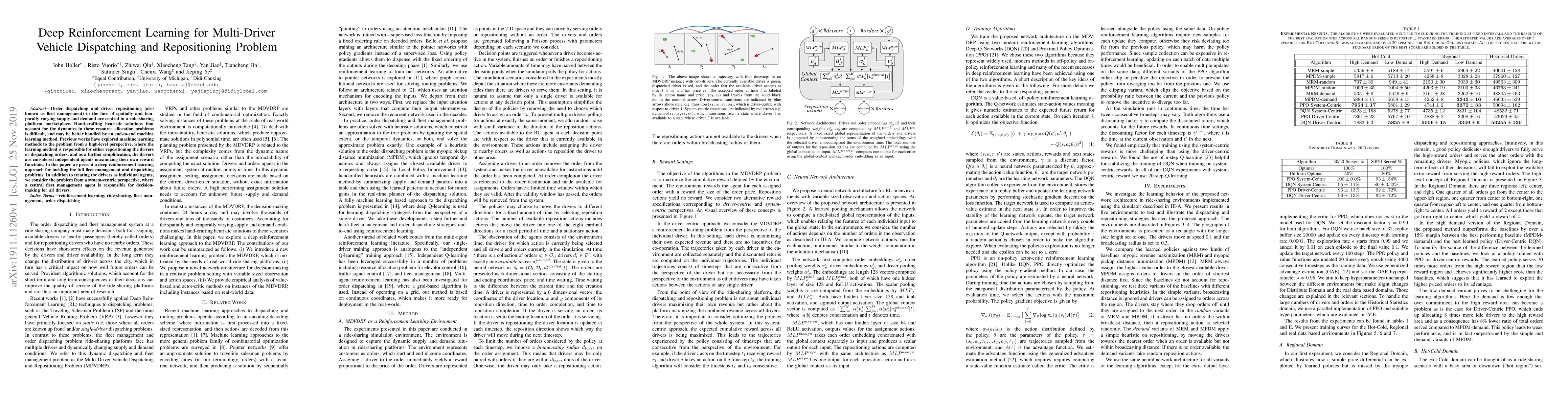 This paper proposes a deep reinforcement learning method for managing and dispatching drivers in a ride-sharing platform, addressing both fleet management and order dispatching. Unlike previous methods, it employs a central fleet management agent to optimize decisions for all drivers, considering them as interconnected agents rather than independent entities.