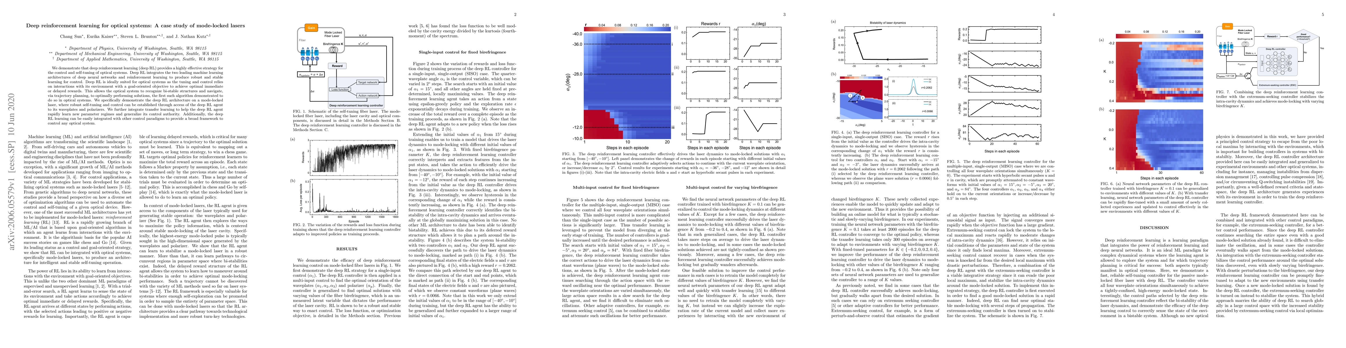 This paper demonstrates deep reinforcement learning (deep RL) as an effective strategy for controlling and self-tuning optical systems, specifically mode-locked lasers, by integrating deep neural networks and reinforcement learning for robust performance. The deep RL approach enables the system to recognize bi-stable structures and navigate to optimal solutions, with transfer learning aiding rapid learning and generalization.