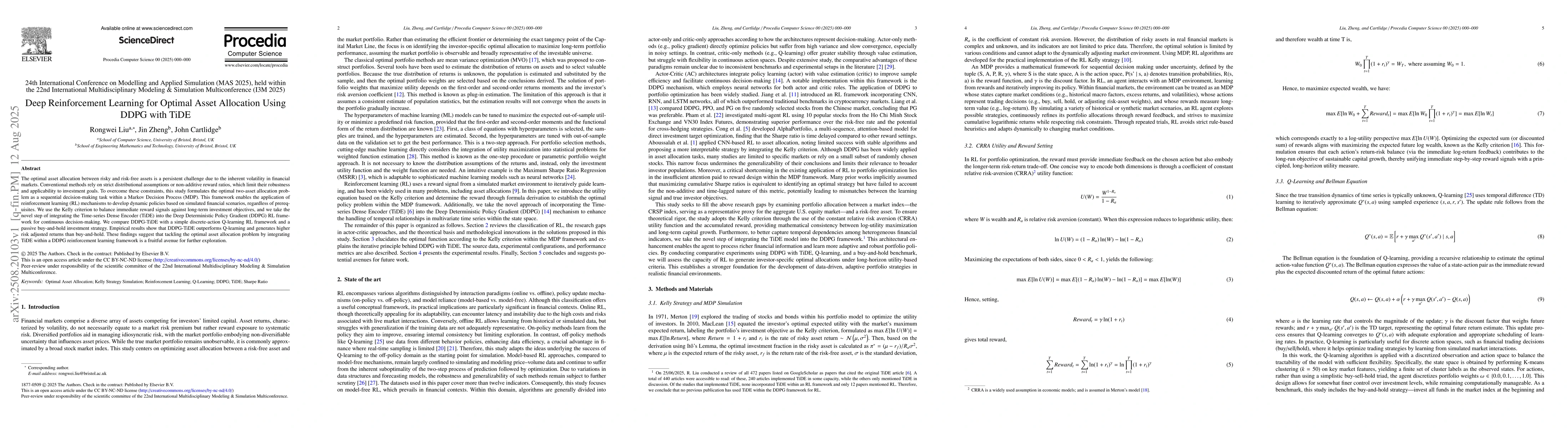 The optimal asset allocation between risky and risk-free assets is a persistent challenge due to the inherent volatility in financial markets. Conventional methods rely on strict distributional assumptions or non-additive reward ratios, which limit their robustness and applicability to investment goals. To overcome these constraints, this study formulates the optimal two-asset allocation problem as a sequential decision-making task within a Markov Decision Process (MDP). This framework enables the application of reinforcement learning (RL) mechanisms to develop dynamic policies based on simulated financial scenarios, regardless of prerequisites. We use the Kelly criterion to balance immediate reward signals against long-term investment objectives, and we take the novel step of integrating the Time-series Dense Encoder (TiDE) into the Deep Deterministic Policy Gradient (DDPG) RL framework for continuous decision-making. We compare DDPG-TiDE with a simple discrete-action Q-learning RL framework and a passive buy-and-hold investment strategy. Empirical results show that DDPG-TiDE outperforms Q-learning and generates higher risk adjusted returns than buy-and-hold. These findings suggest that tackling the optimal asset allocation problem by integrating TiDE within a DDPG reinforcement learning framework is a fruitful avenue for further exploration.