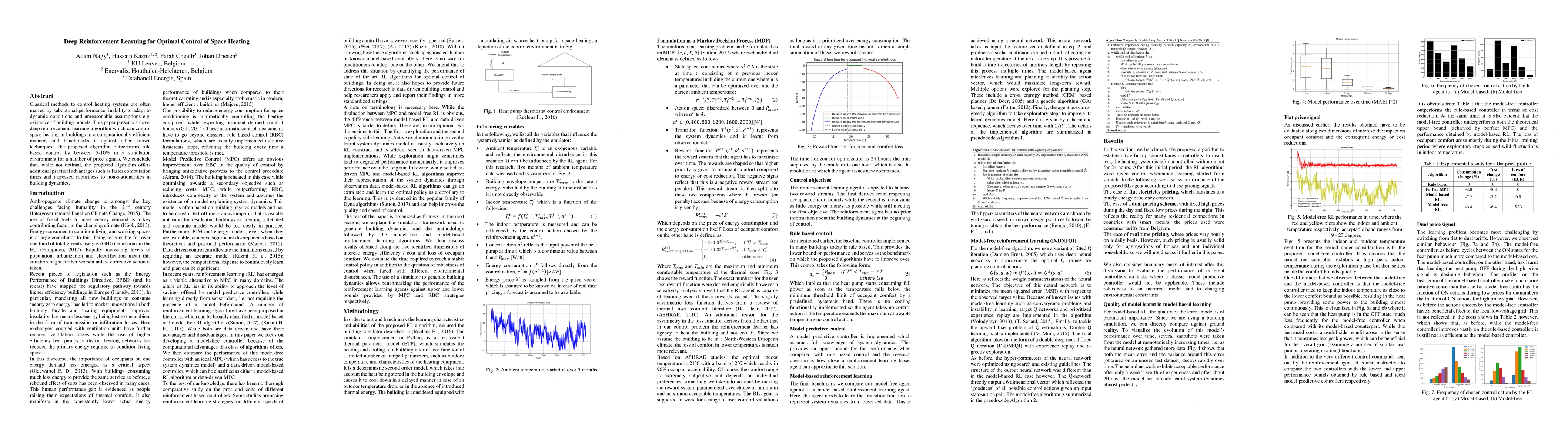 This paper introduces a deep reinforcement learning algorithm for optimal space heating control, demonstrating a 5-10% improvement over rule-based methods in simulations. The proposed method offers faster computation times and greater robustness to dynamic building conditions.