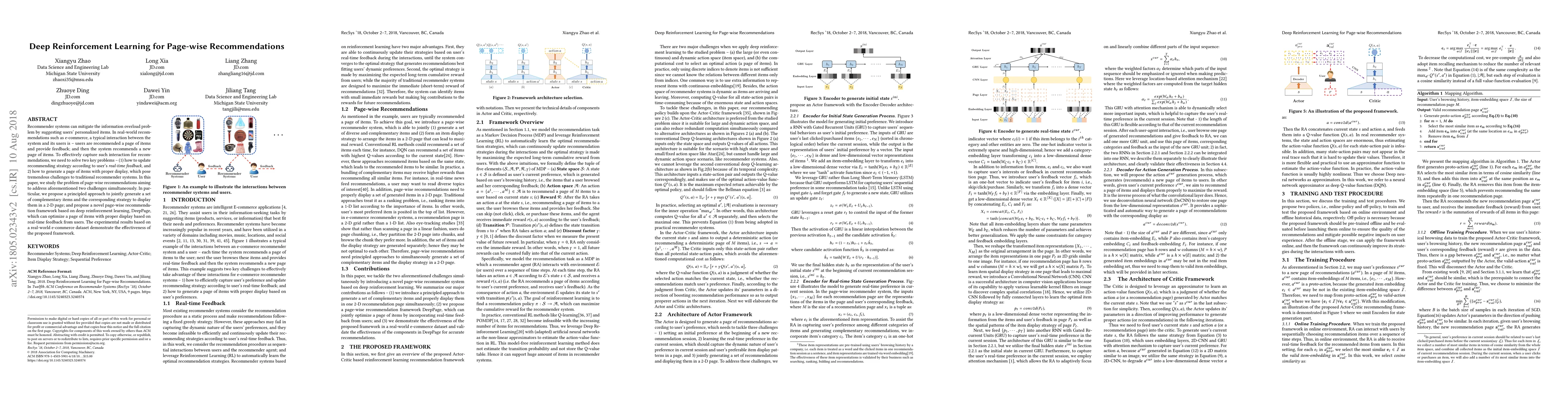 This paper proposes a deep reinforcement learning framework, DeepPage, for page-wise recommendations in e-commerce to optimize item selection and display based on real-time user feedback. The approach effectively addresses challenges in generating complementary items and optimizing their display on a page.