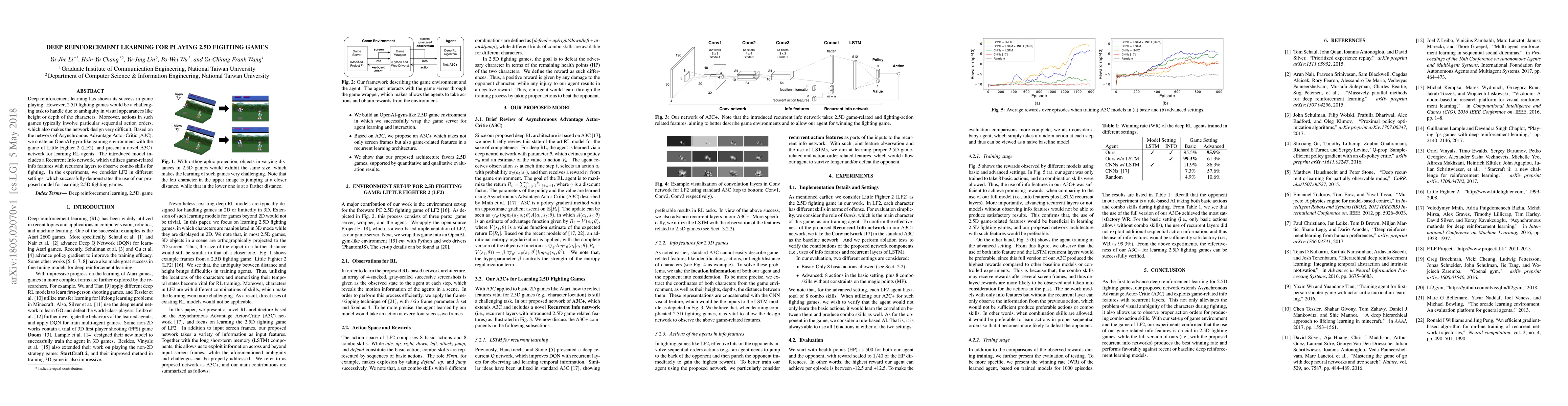 Deep reinforcement learning has shown its success in game playing. However, 2.5D fighting games would be a challenging task to handle due to ambiguity in visual appearances like height or depth of the characters. Moreover, actions in such games typically involve particular sequential action orders, which also makes the network design very difficult. Based on the network of Asynchronous Advantage Actor-Critic (A3C), we create an OpenAI-gym-like gaming environment with the game of Little Fighter 2 (LF2), and present a novel A3C+ network for learning RL agents. The introduced model includes a Recurrent Info network, which utilizes game-related info features with recurrent layers to observe combo skills for fighting. In the experiments, we consider LF2 in different settings, which successfully demonstrates the use of our proposed model for learning 2.5D fighting games.